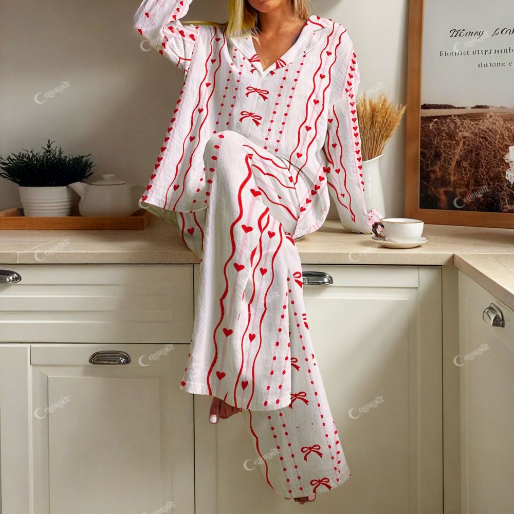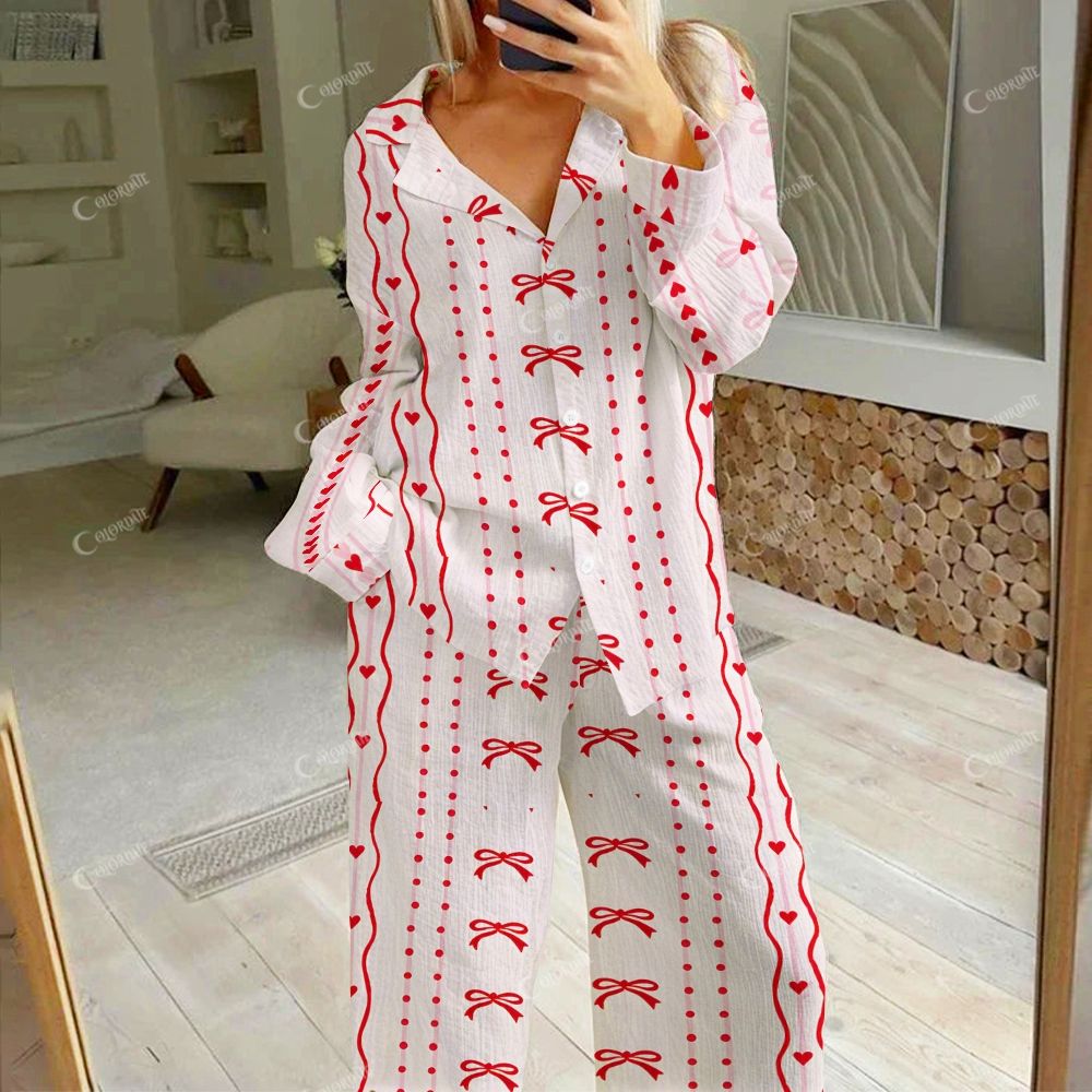 Women's Romantic Red Ribbon Bow Print Cardigan Homewear Set