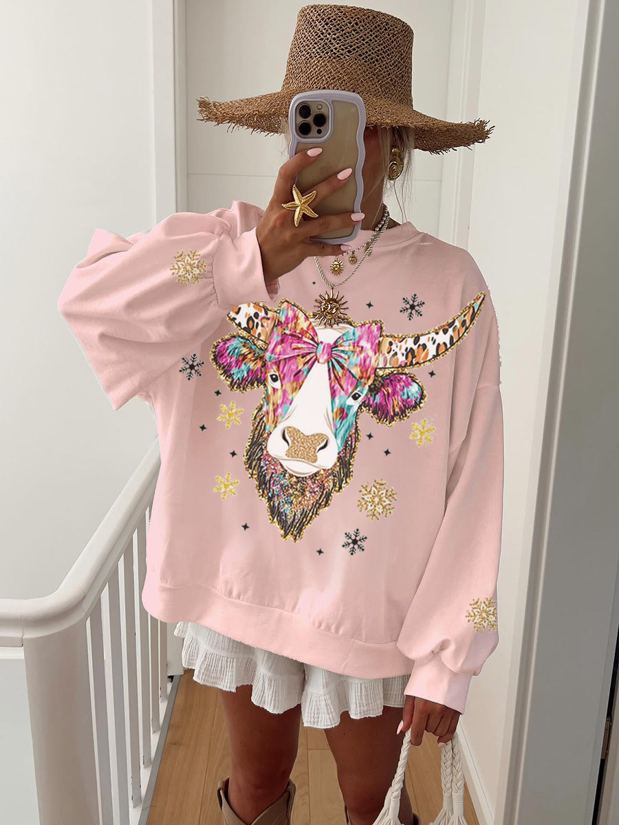 Women's Christmas Cow Print Home Long Sleeve Sweatshirt