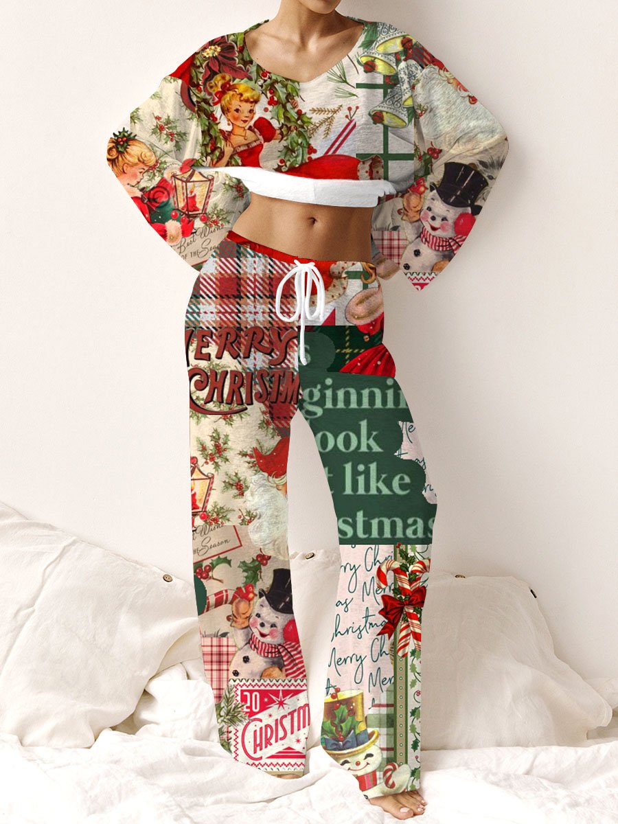 Women's Retro Christmas Girl Print Long Sleeve Homewear Set
