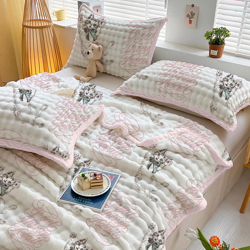 Soft Plush Waffle Blanket With Cute Cat Illustration Print
