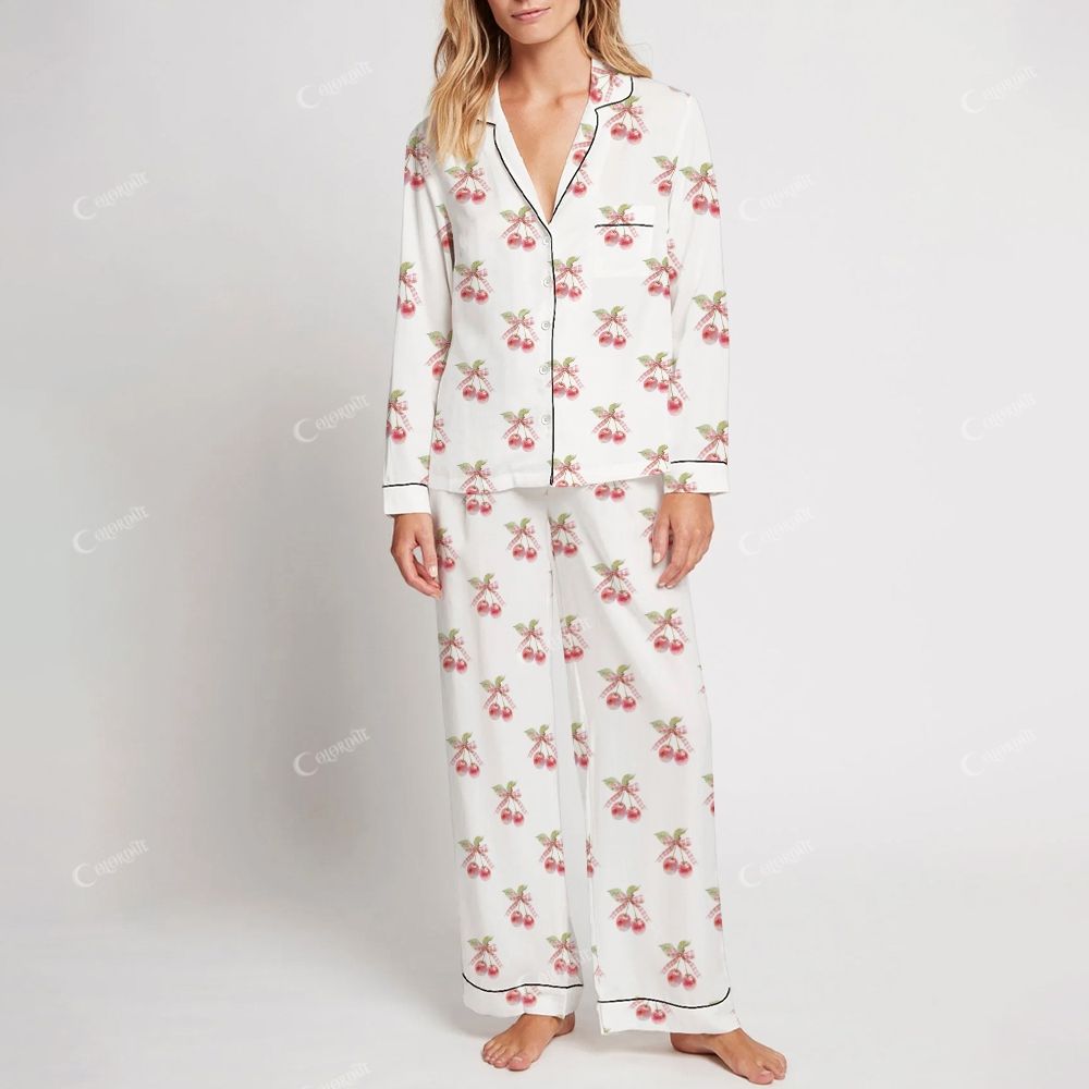Colordate Women's Watercolor Cherry Print Home Long Sleeve Suit