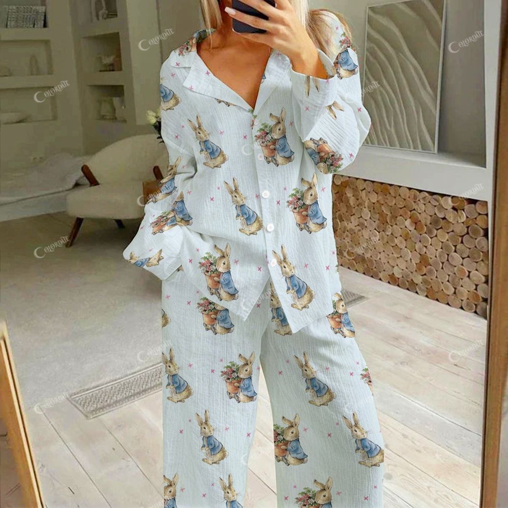 Colordate Women's A Rabbit Holding A Flower Print Cotton Cardigan Homewear Set
