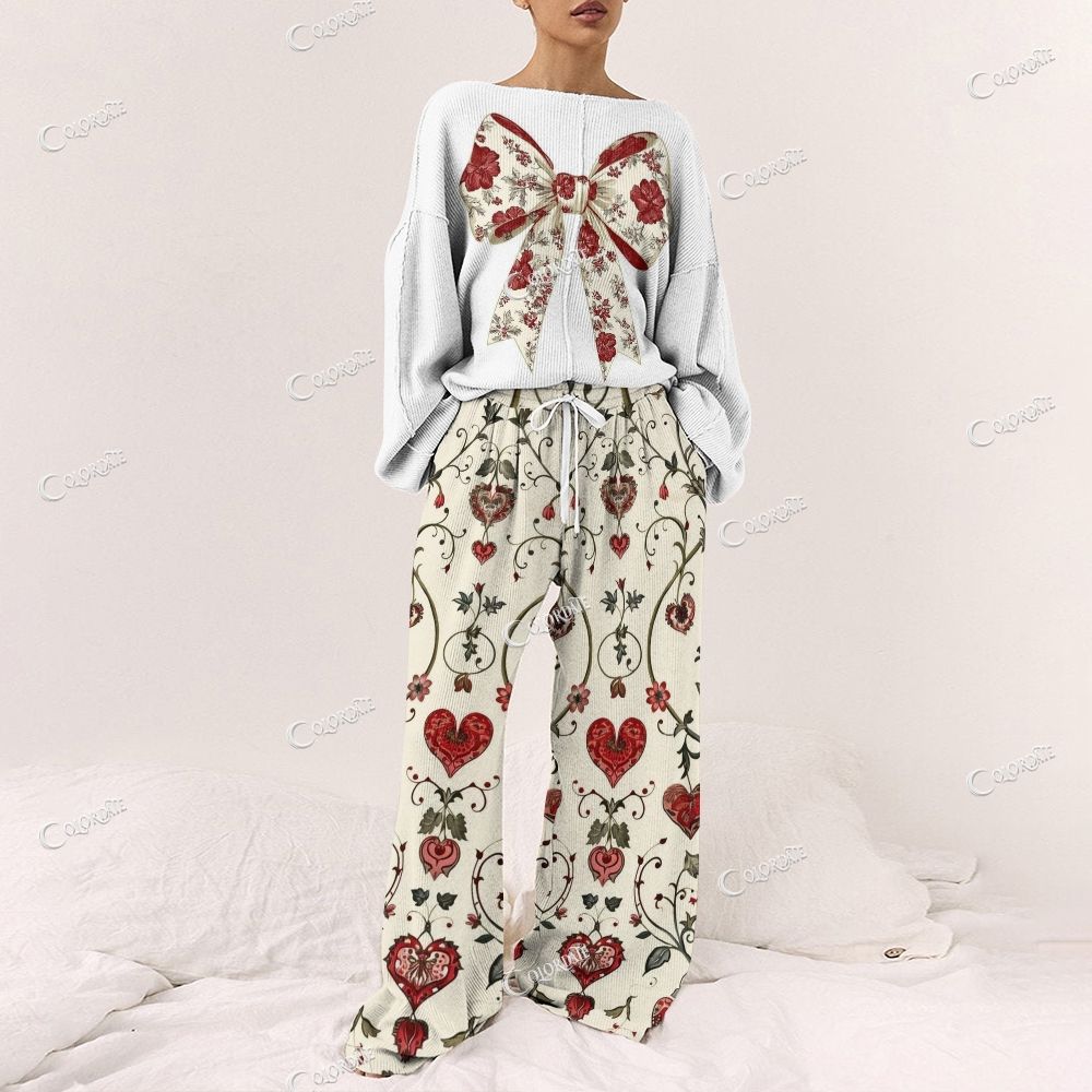 Red Bow Print & Red Floral Loungewear Set For Women