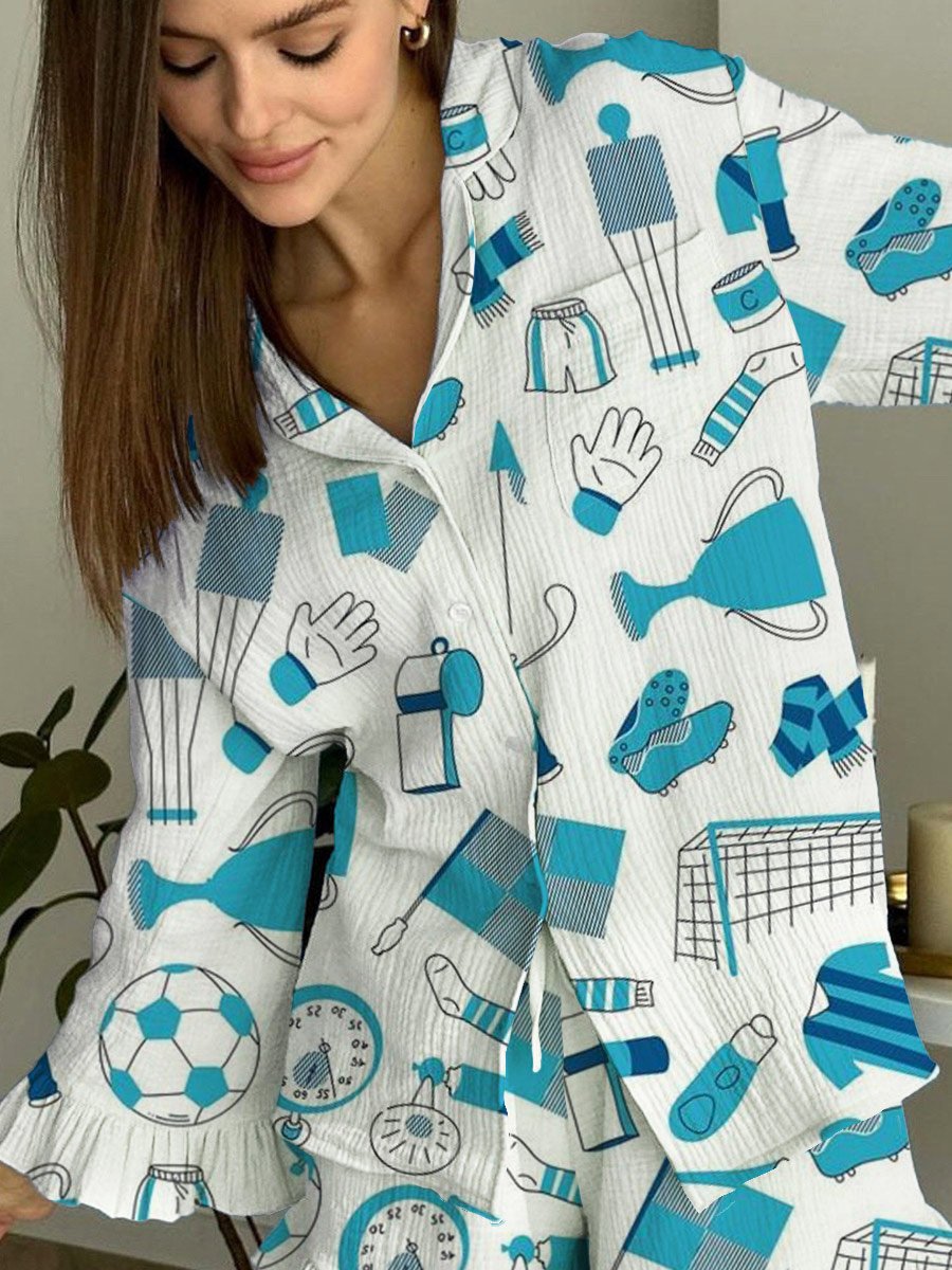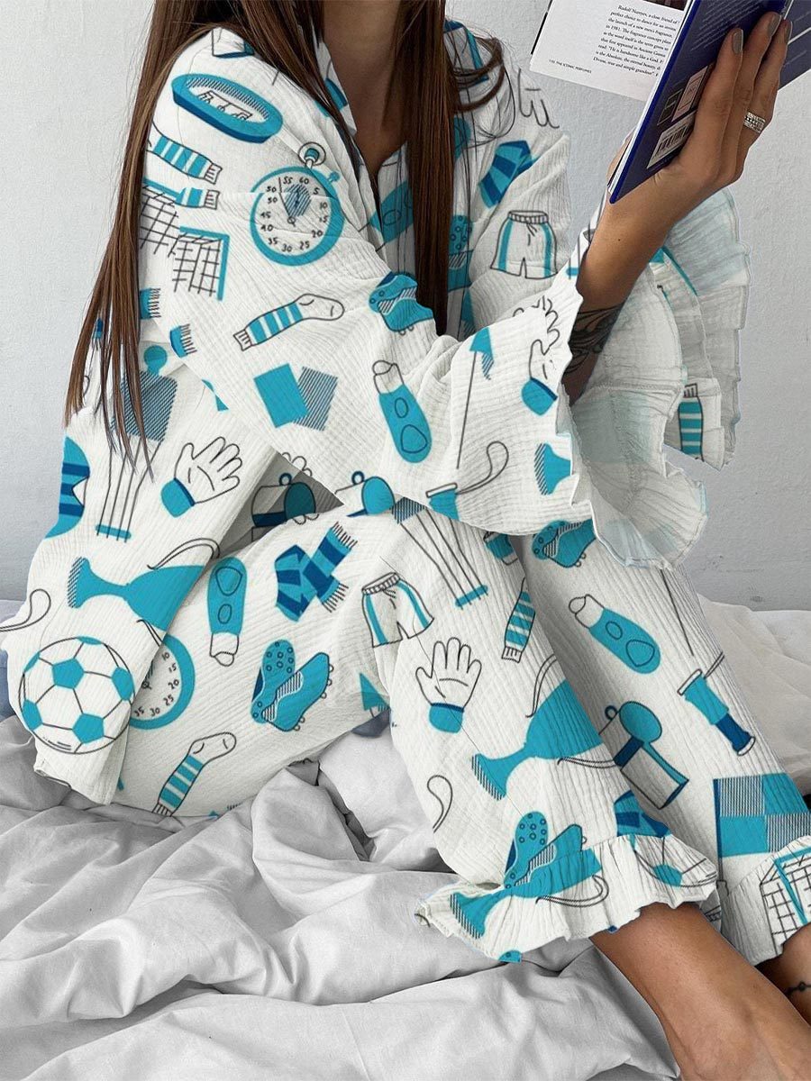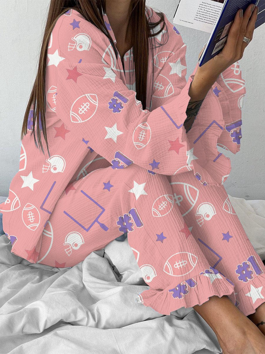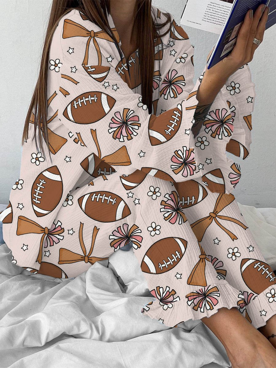 Women's Sports Football Pattern Ruffled Long Sleeve Pants Set