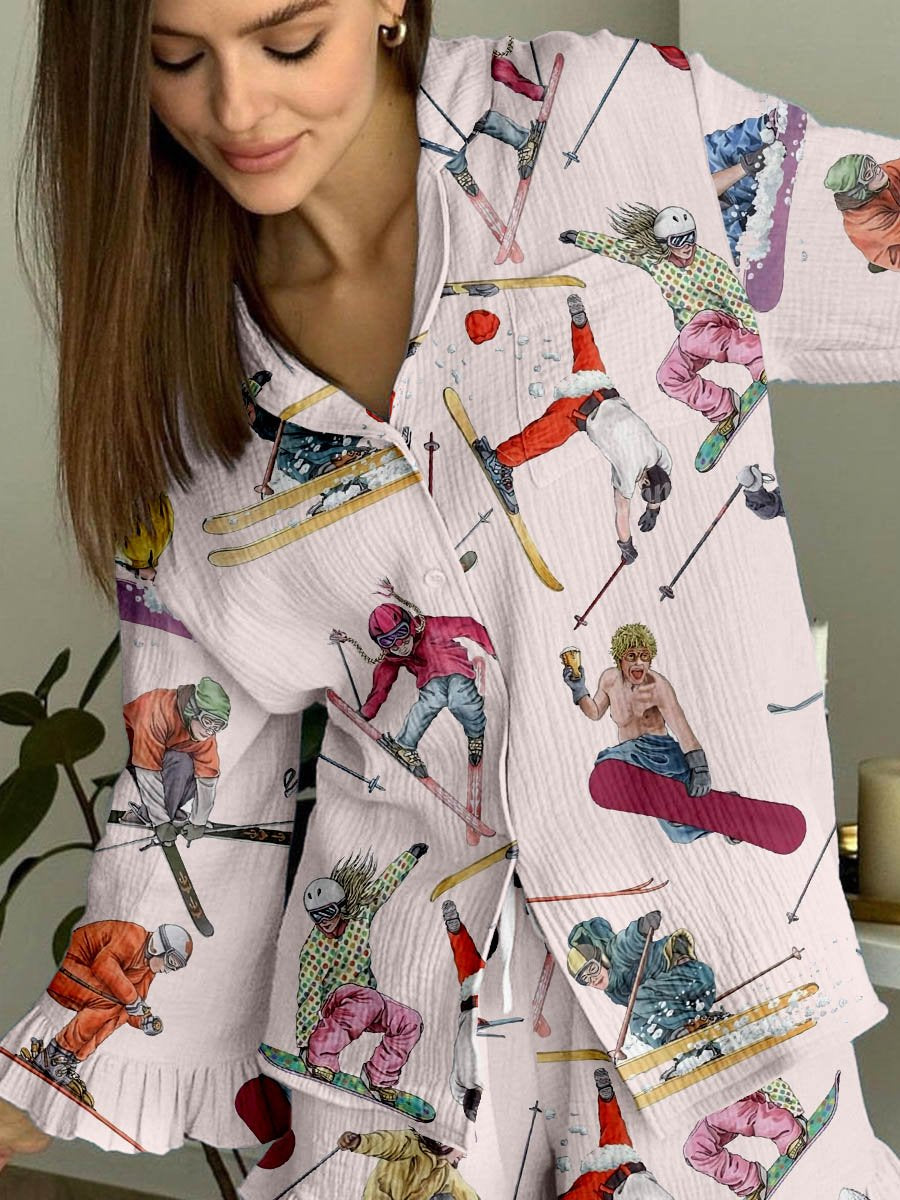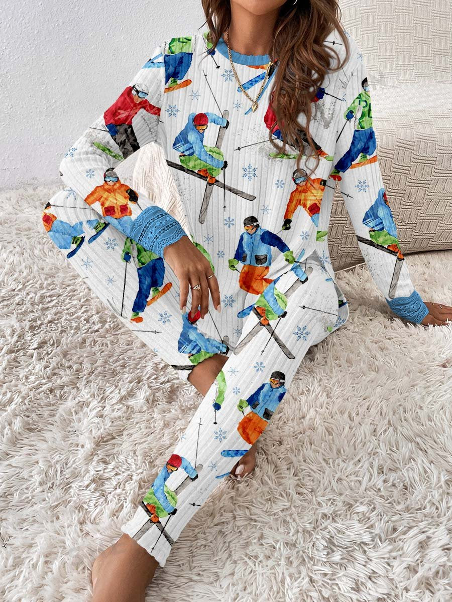Women's Christmas Ski Print Ruffles Loungewear Set