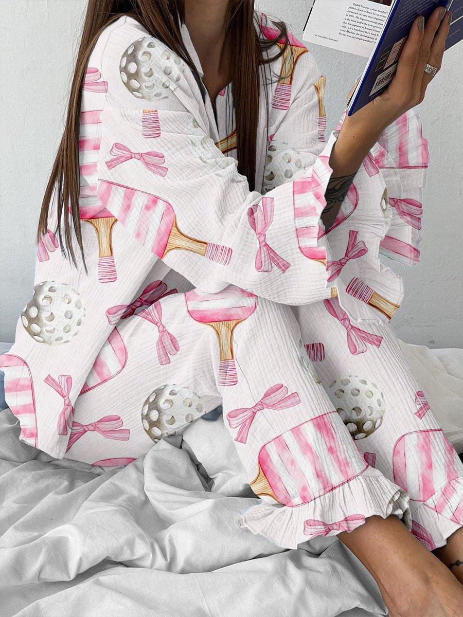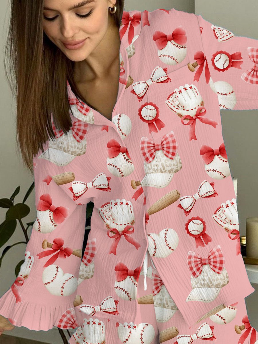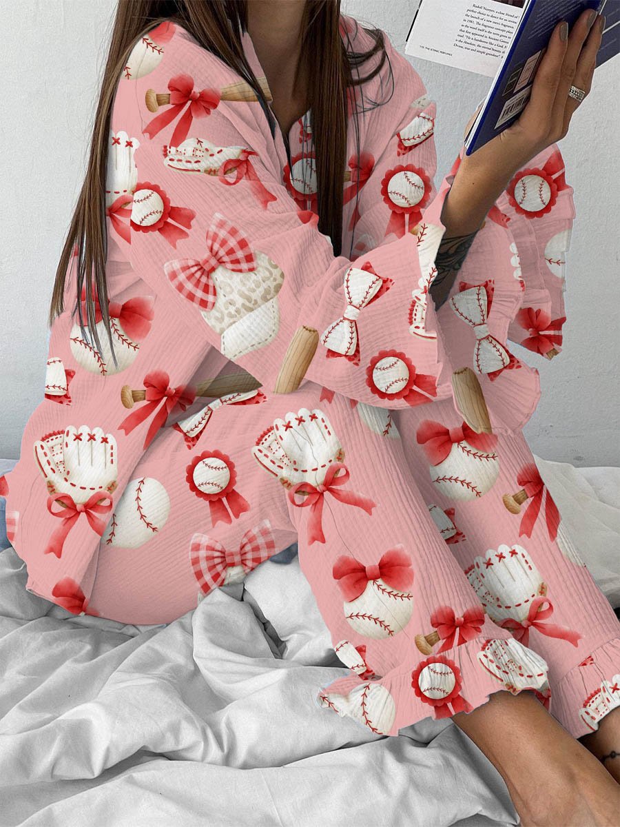 Women's Pink Bow Baseball Print Ruffle Homewear Set
