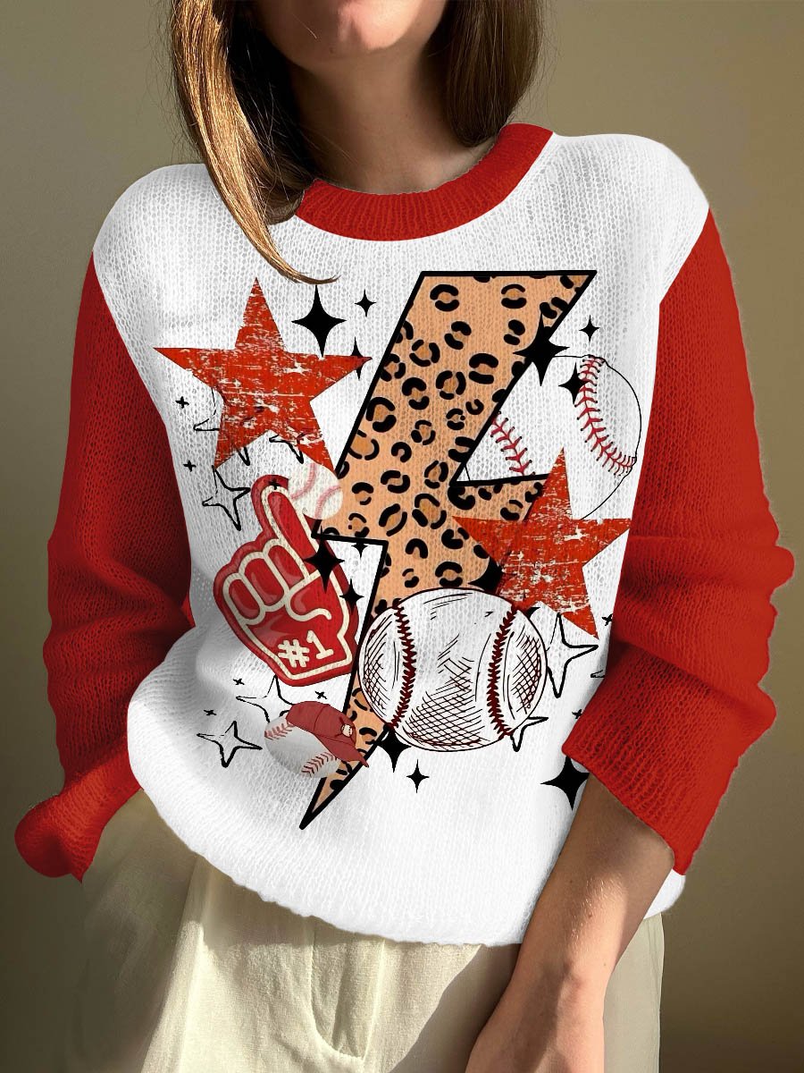 Women's Baseball Lightning Print Crew Neck Sweater