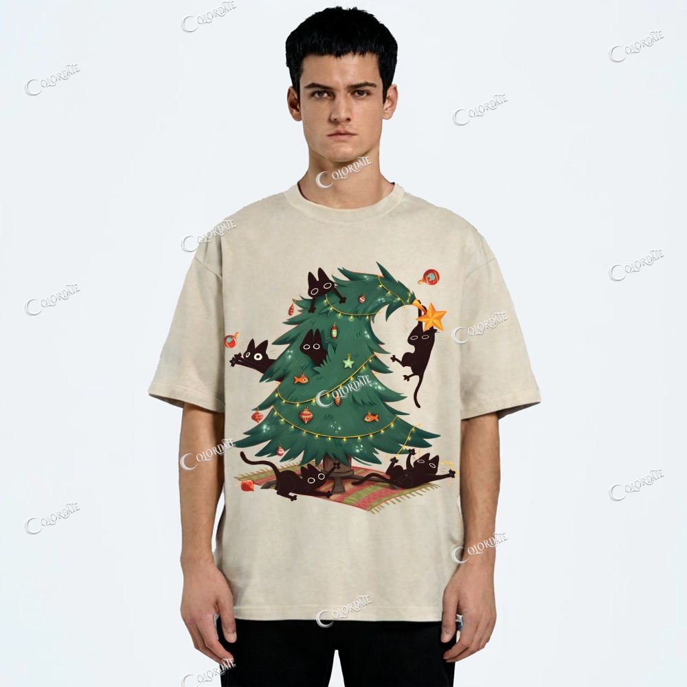 Unisex Christmas Tree And Cute Black Cat Printed Washed Tee$27.99 USD