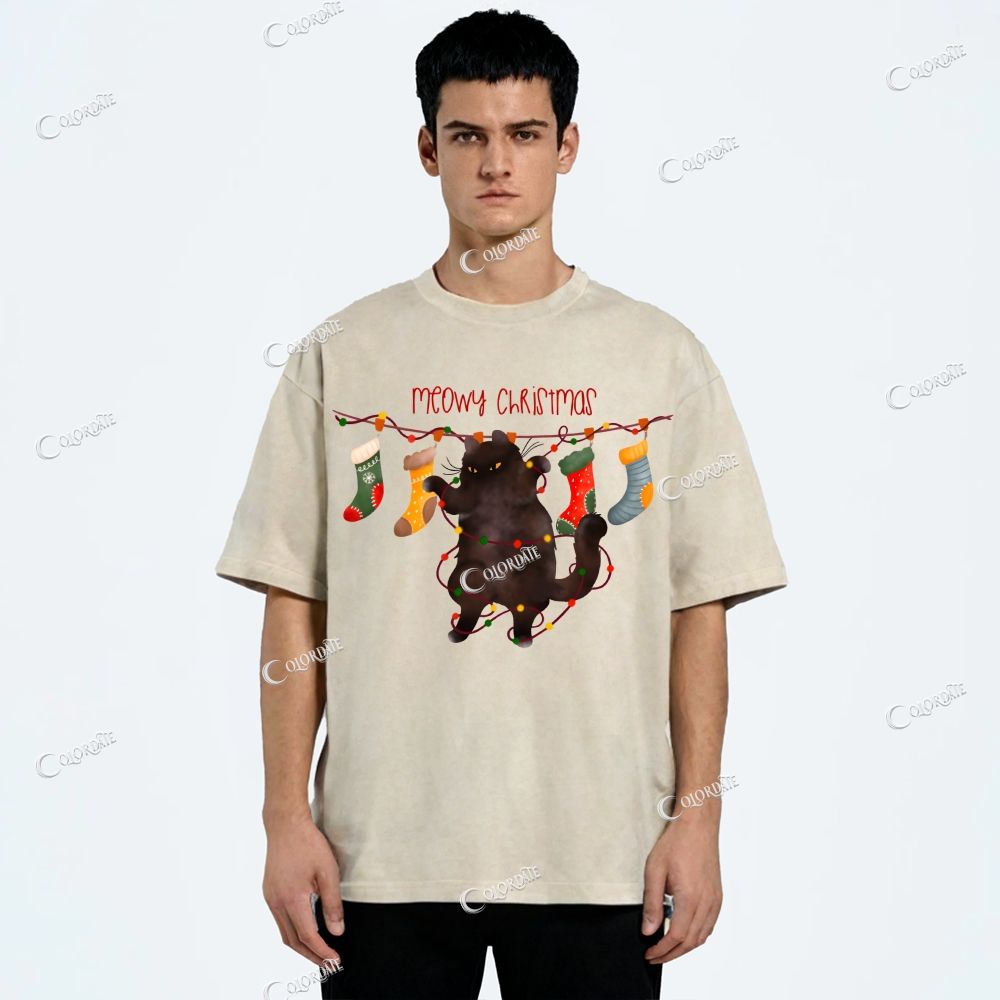 Unisex Kitten And Christmas Stocking Printed Washed Tee$27.99 USD