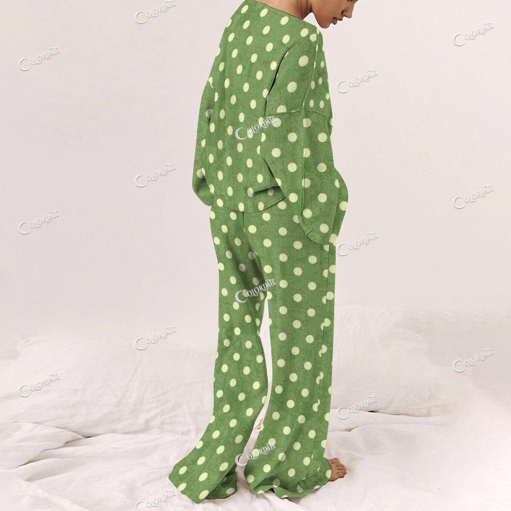 • Women's Bright Green Polka Dot Print Long Sleeve Pajama Set