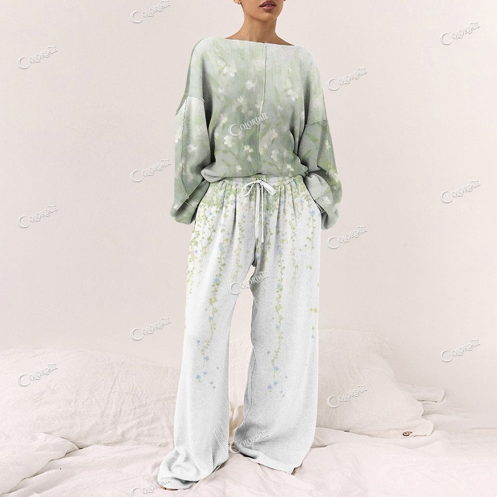 Colordate Women's Christmas Floral Pattern Prints Long Sleeve Cotton Homewear Set