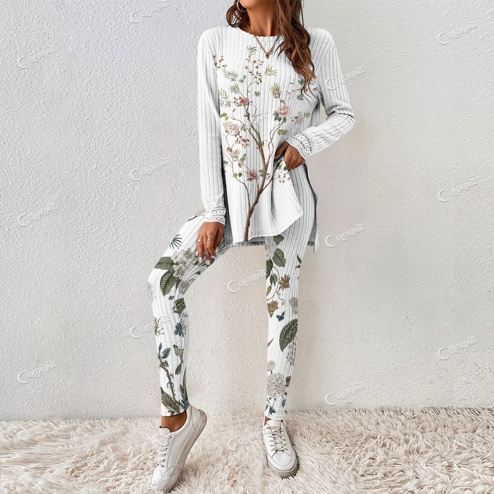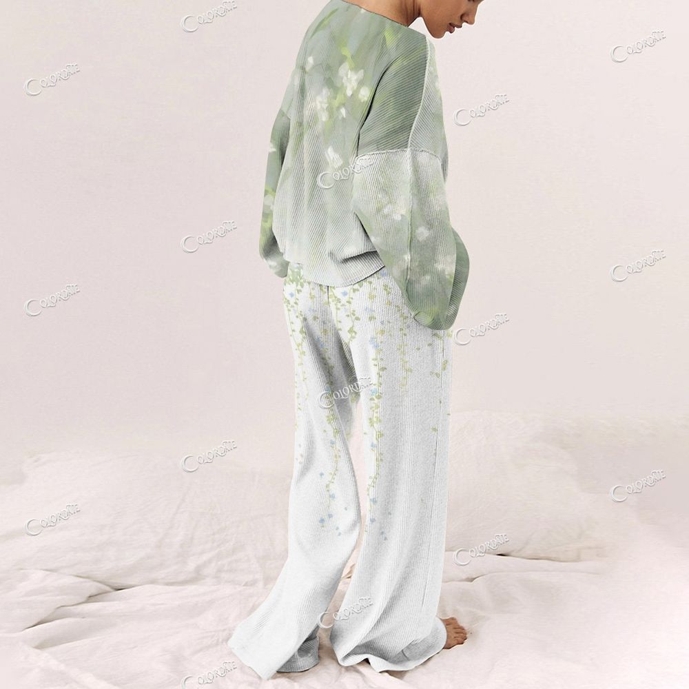 Light Floral White Ribbed Women's Long Sleeve Suit