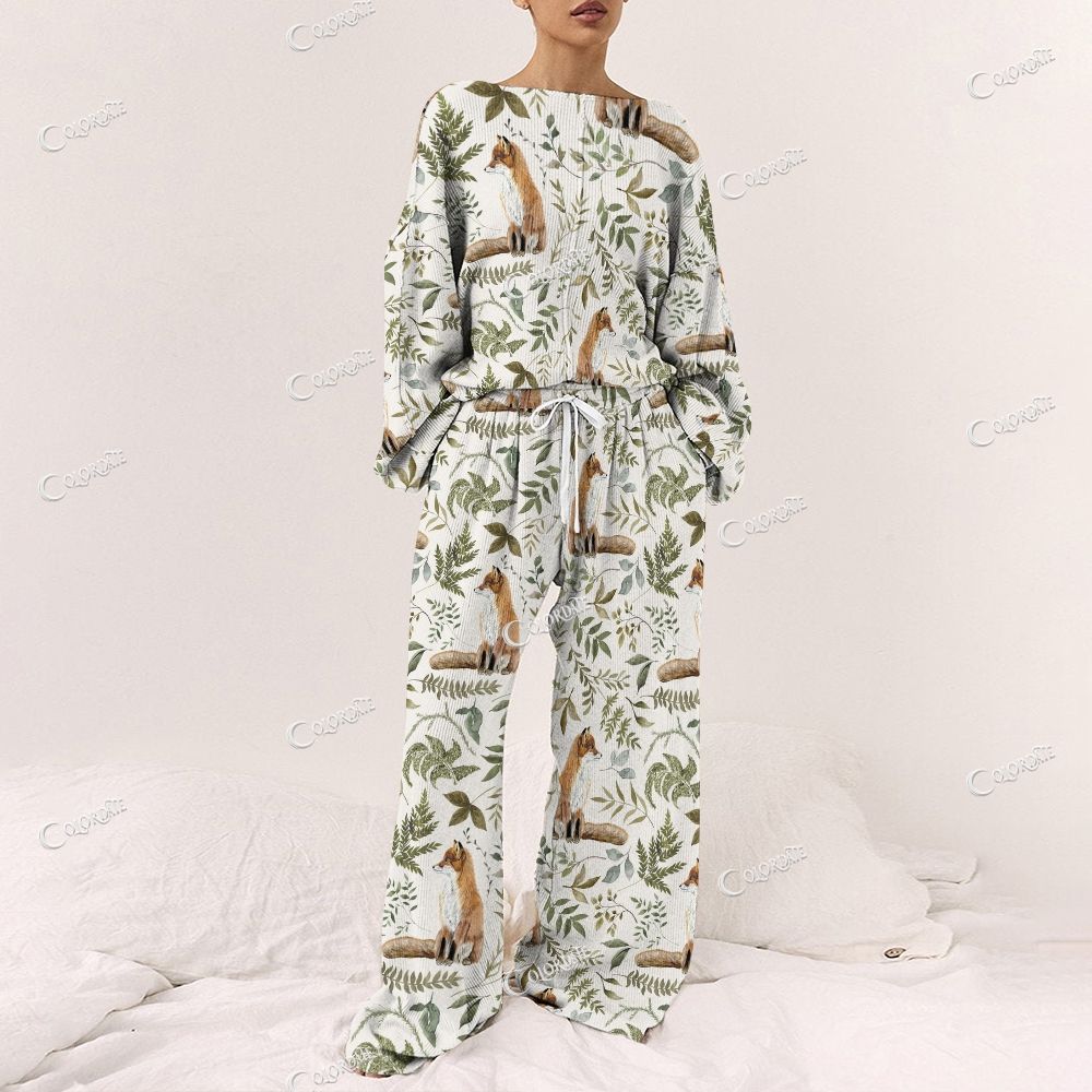Colordate Women's Forest Fox Pattern Print Long Sleeve Pajama Set