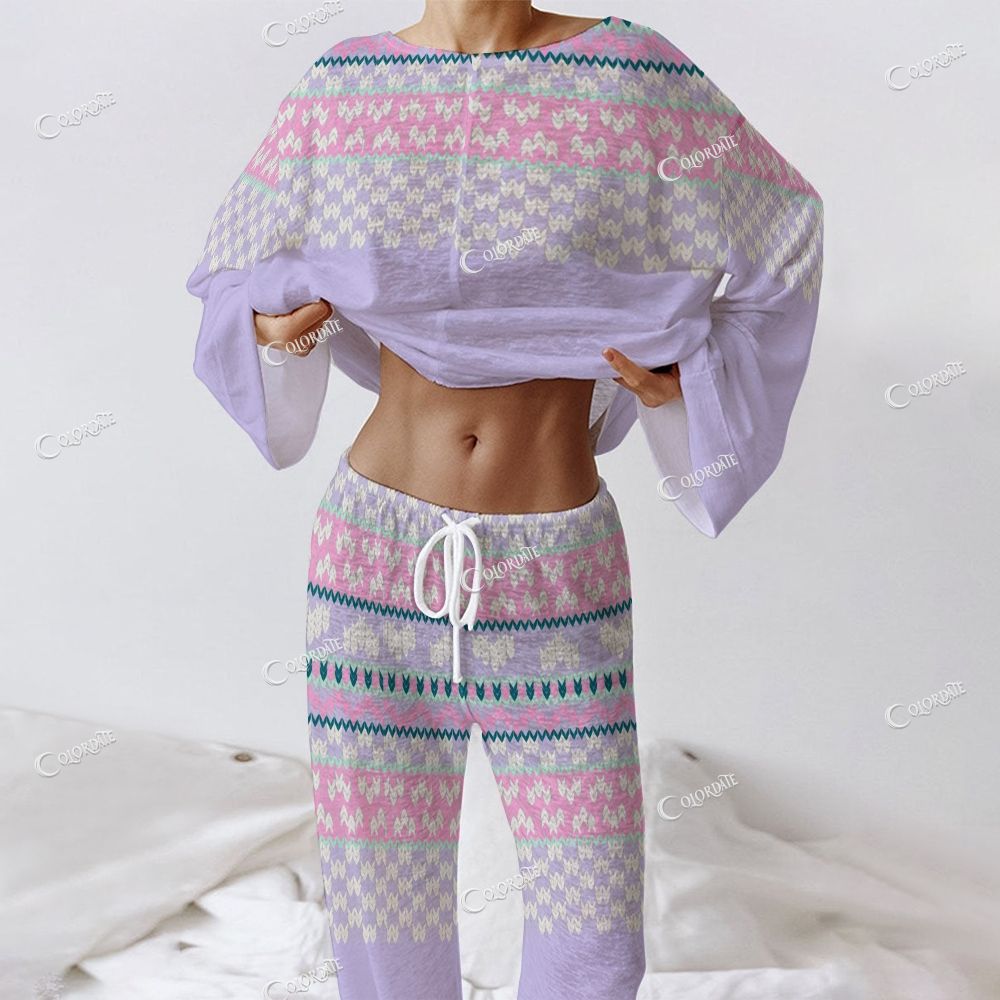 Colordate Women's Knitted Pattern Print Long Sleeve Cotton Homewear Set