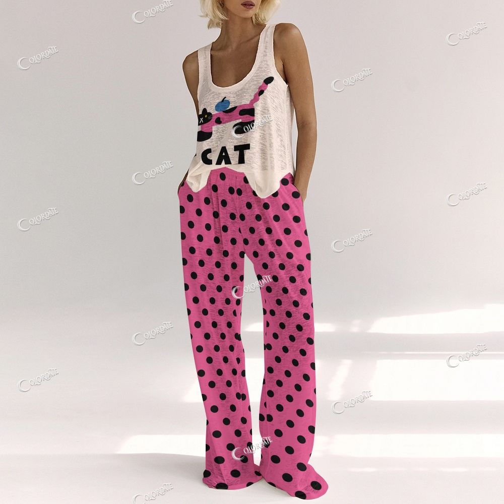 Women's Cute Cat & Polka Dot Print Vest and Pants Set