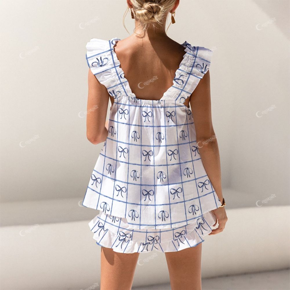 Colordate Blue Checkered And Bow Print Short Tank Top Shorts Pajama Set