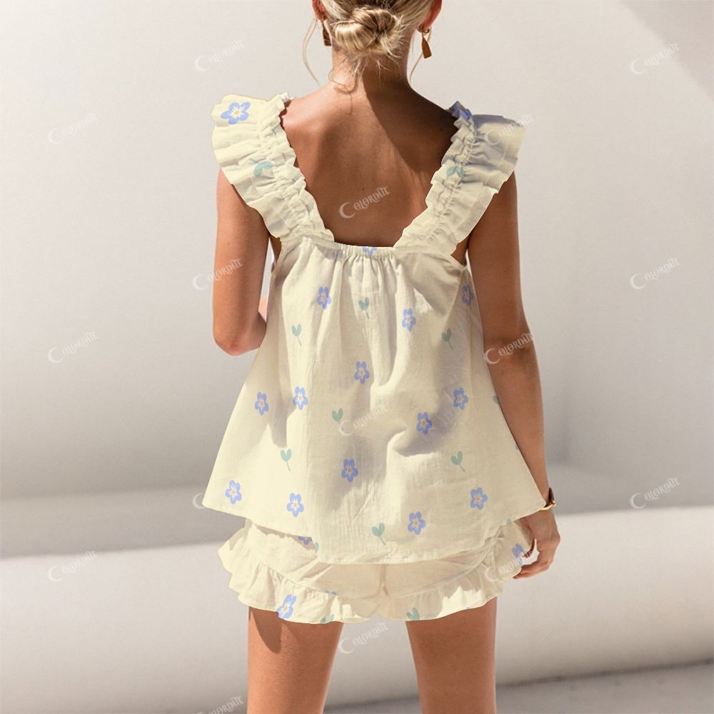 Colordate Blue Small Flowers And Green Bud Prints Short Tank Top Shorts Pajama Set