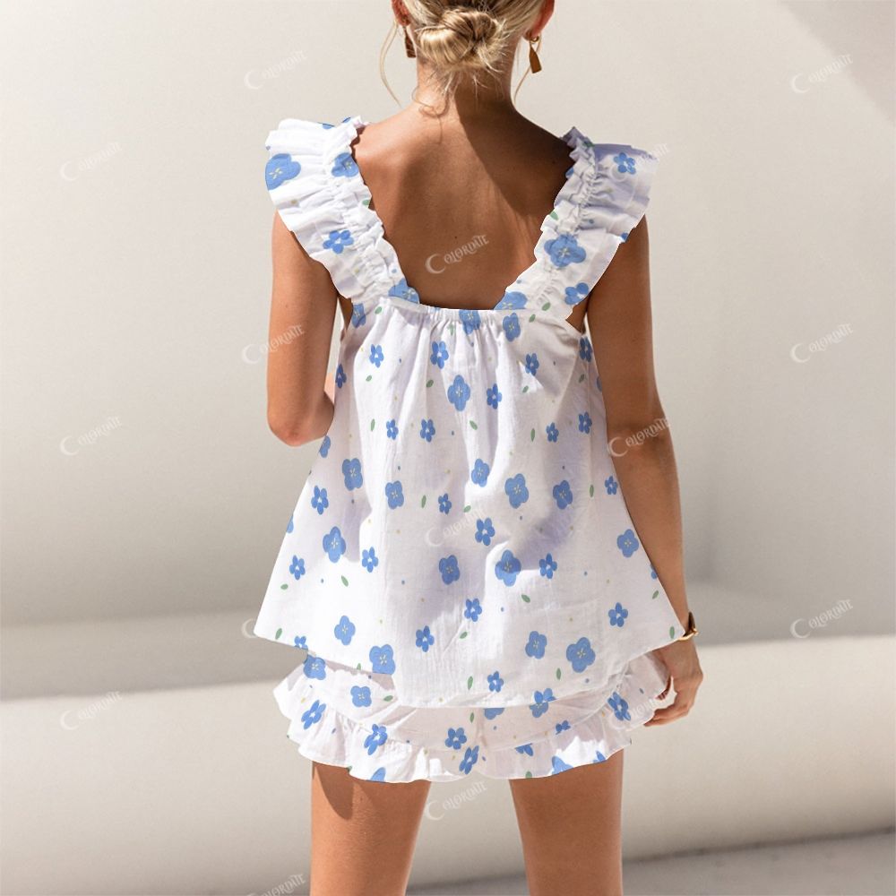 Colordate Blue Small Flowers Prints Short Tank Top Shorts Pajama Set