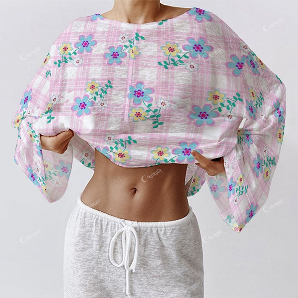 Colordate Women's Blue Small Flowers And Checkered Pattern Patchwork Print Long Sleeve Homewear Set