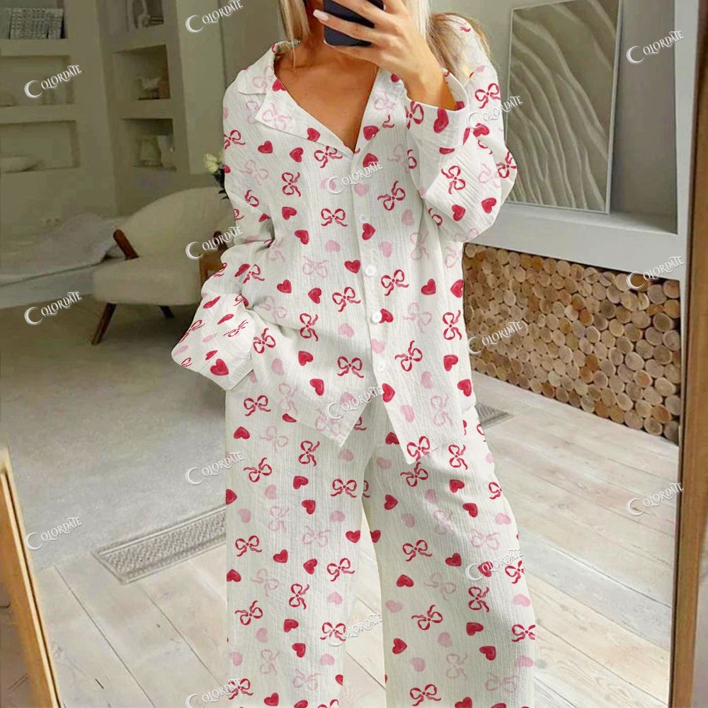 Colordate Women's Bow And Heart Print Cardigan Homewear Set