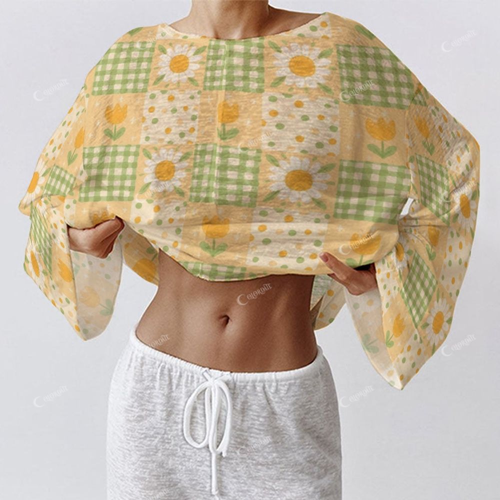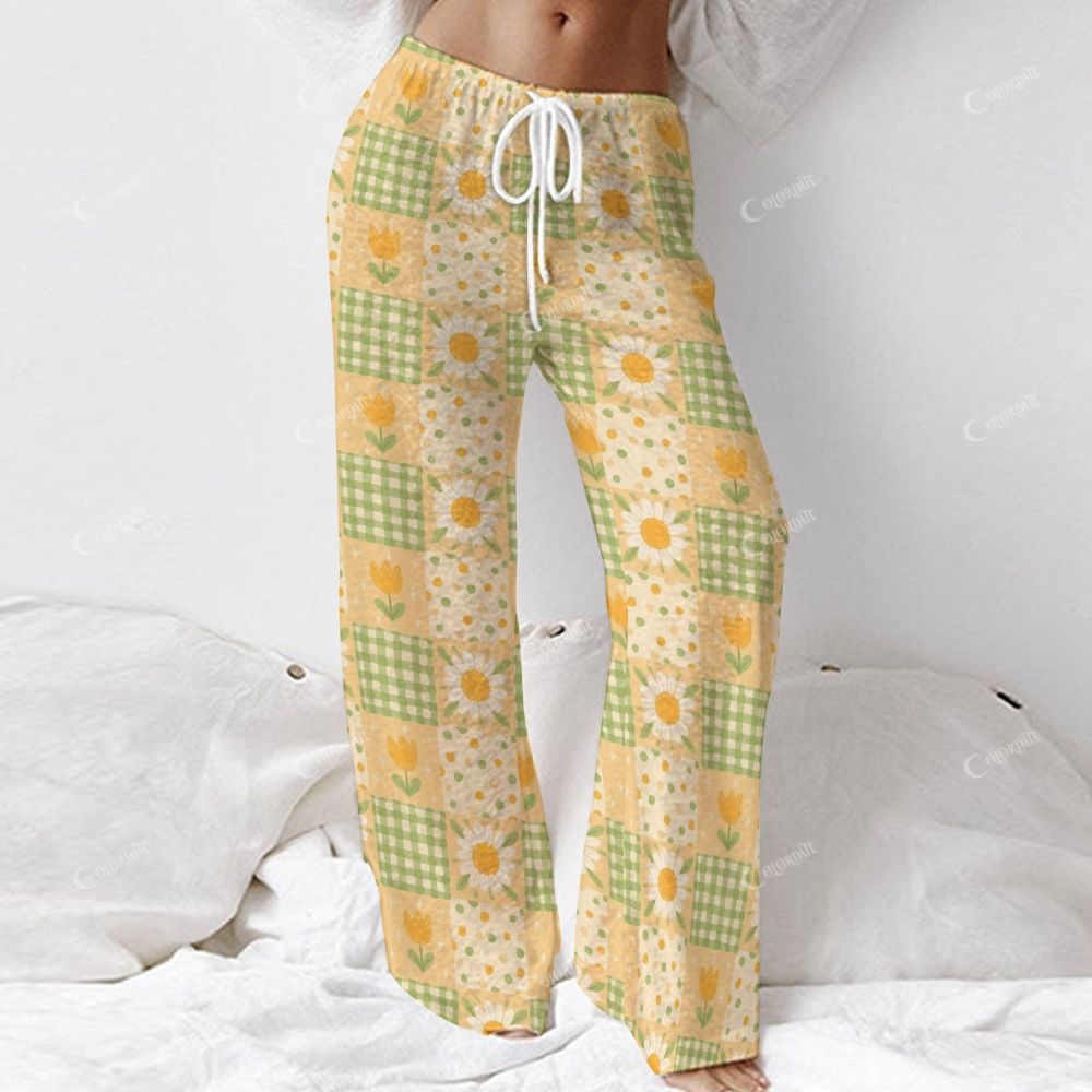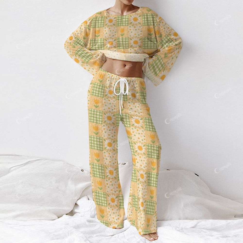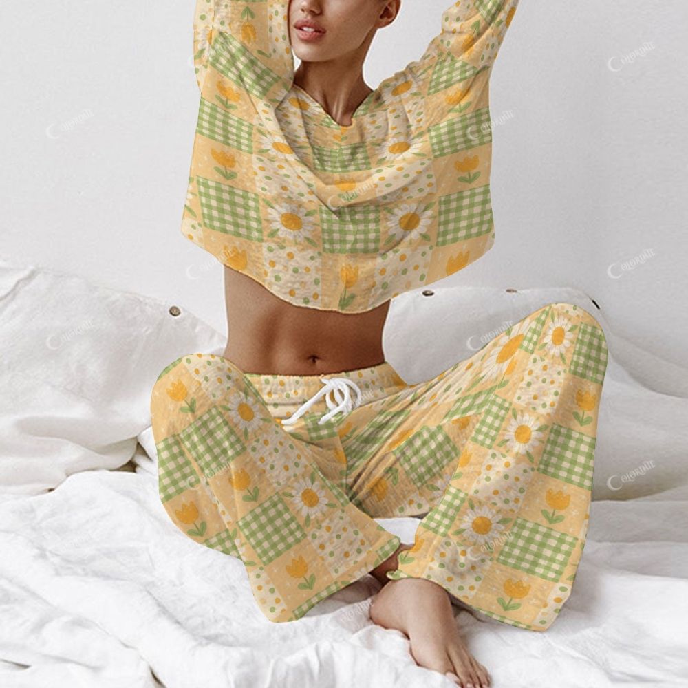 Colordate Women's Floral And Checkered Patchwork Print Long Sleeve Cotton Homewear Set