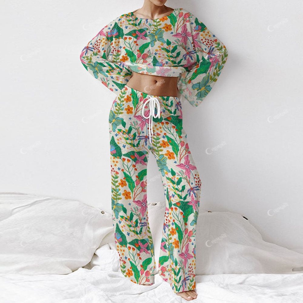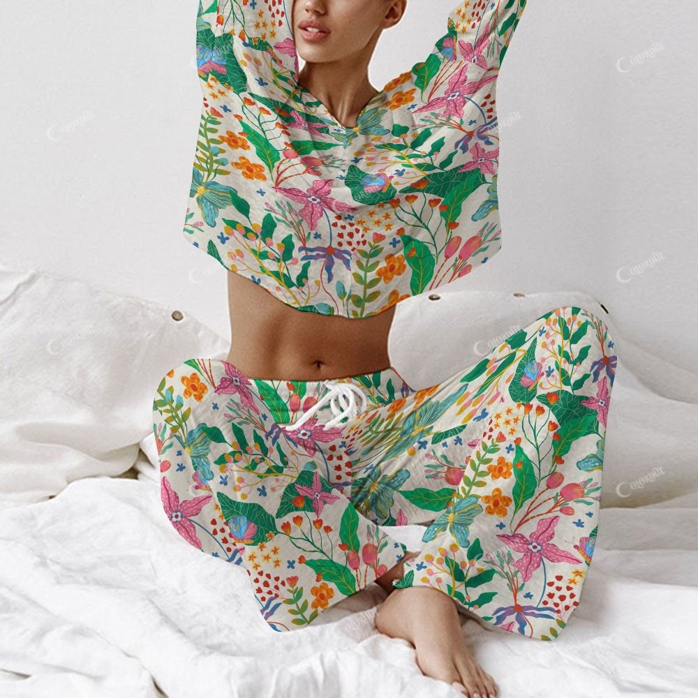 Colordate Women's Floral And Plant Prints Long Sleeve Cotton Homewear Set
