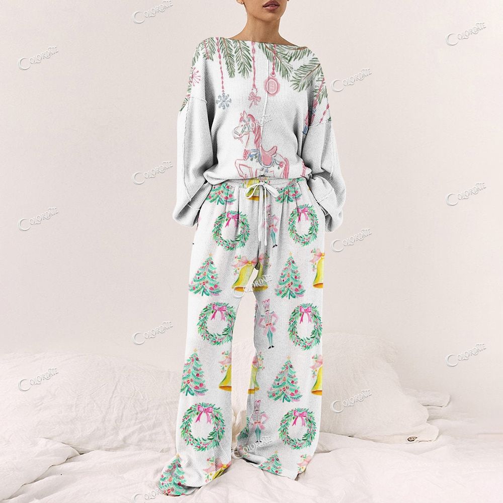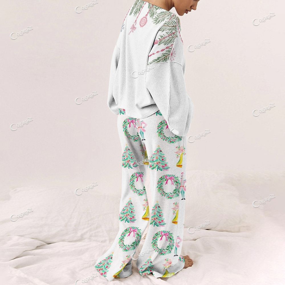 Colordate Women's Watercolor Christmas Pattern Print Long Sleeve Pajama Set