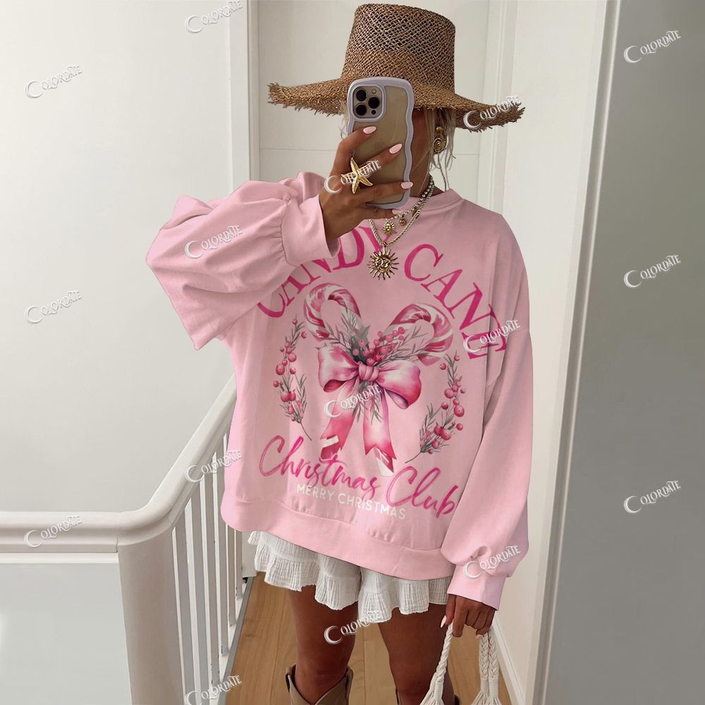 Women's Candy Cane And Bow Print Casual Crew Neck Sweatshirt