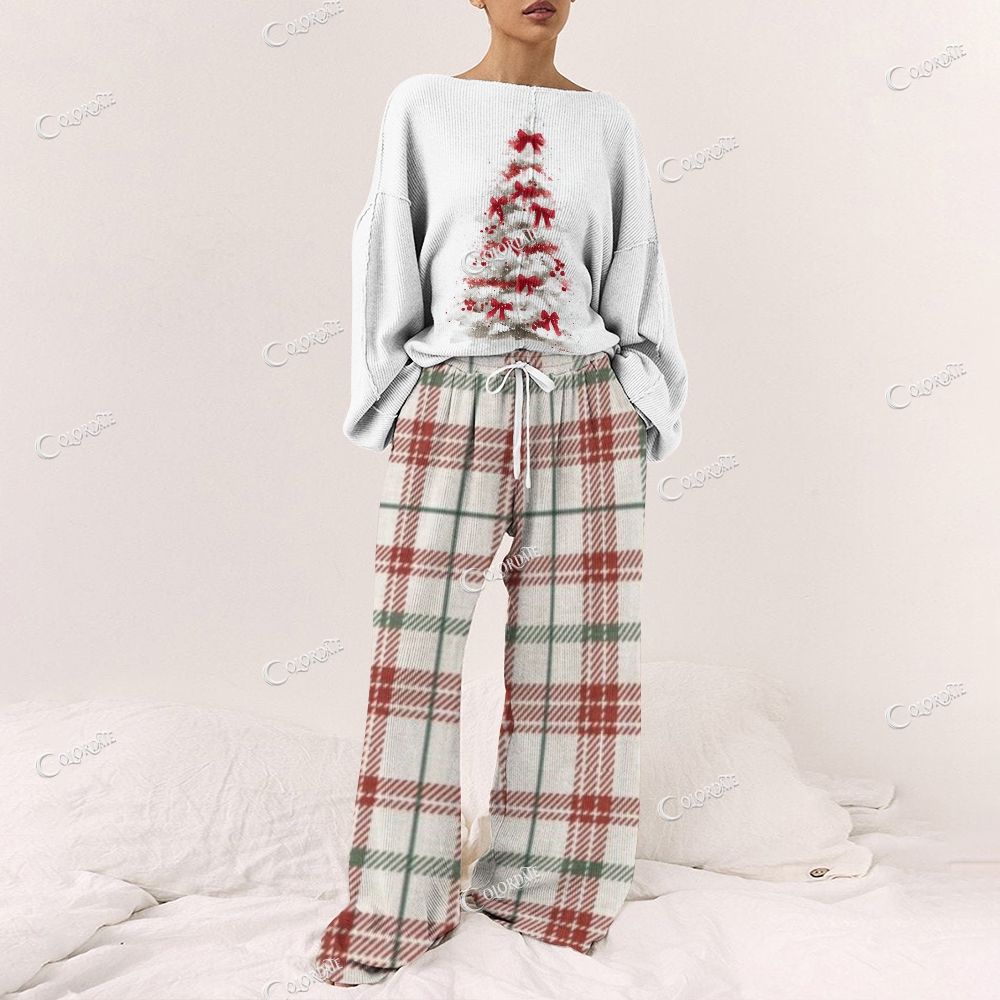 Women's White Christmas Tree & Plaid Print Long Sleeve Pajama Set