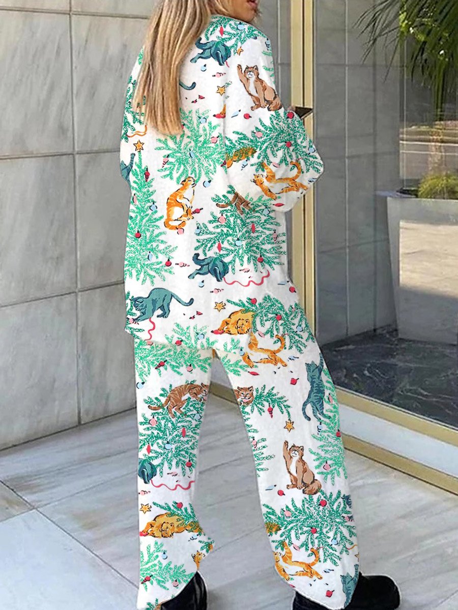 Women's Christmas Cute Animal Art Fun Painting Print Home Long Sleeve Suit
