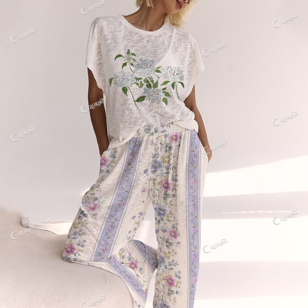 Women's Bow Flower Pattern Round Neck Short Sleeve Pants Suit