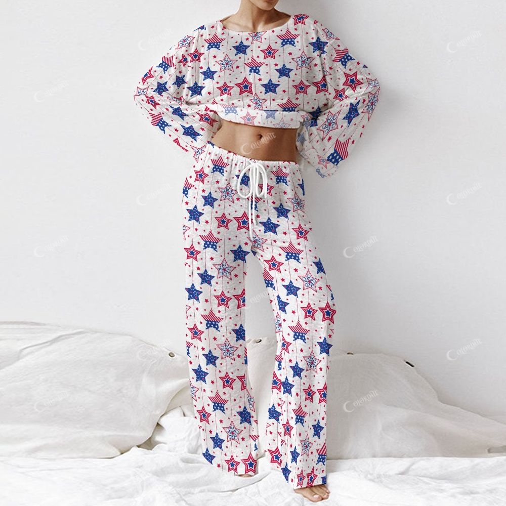 Colordate Women's American Star Print Long Sleeve Cotton Homewear Set