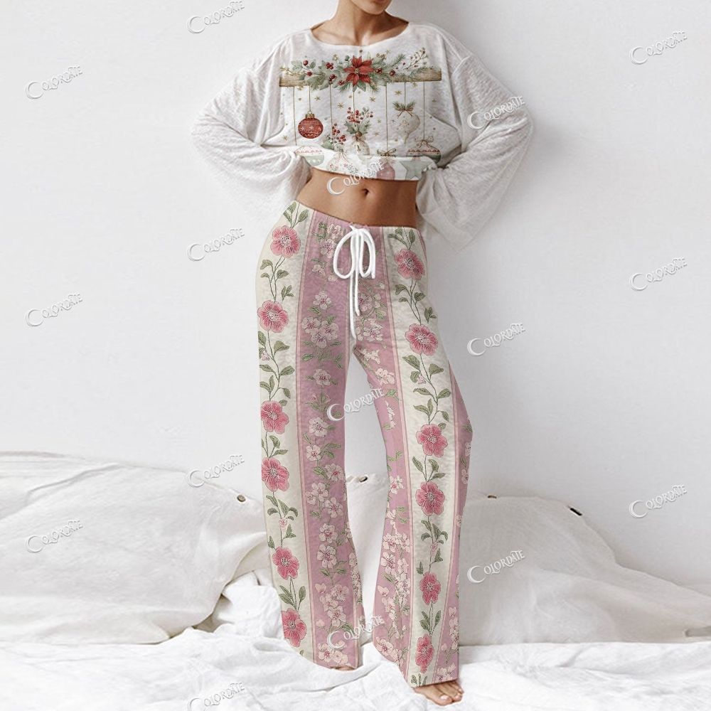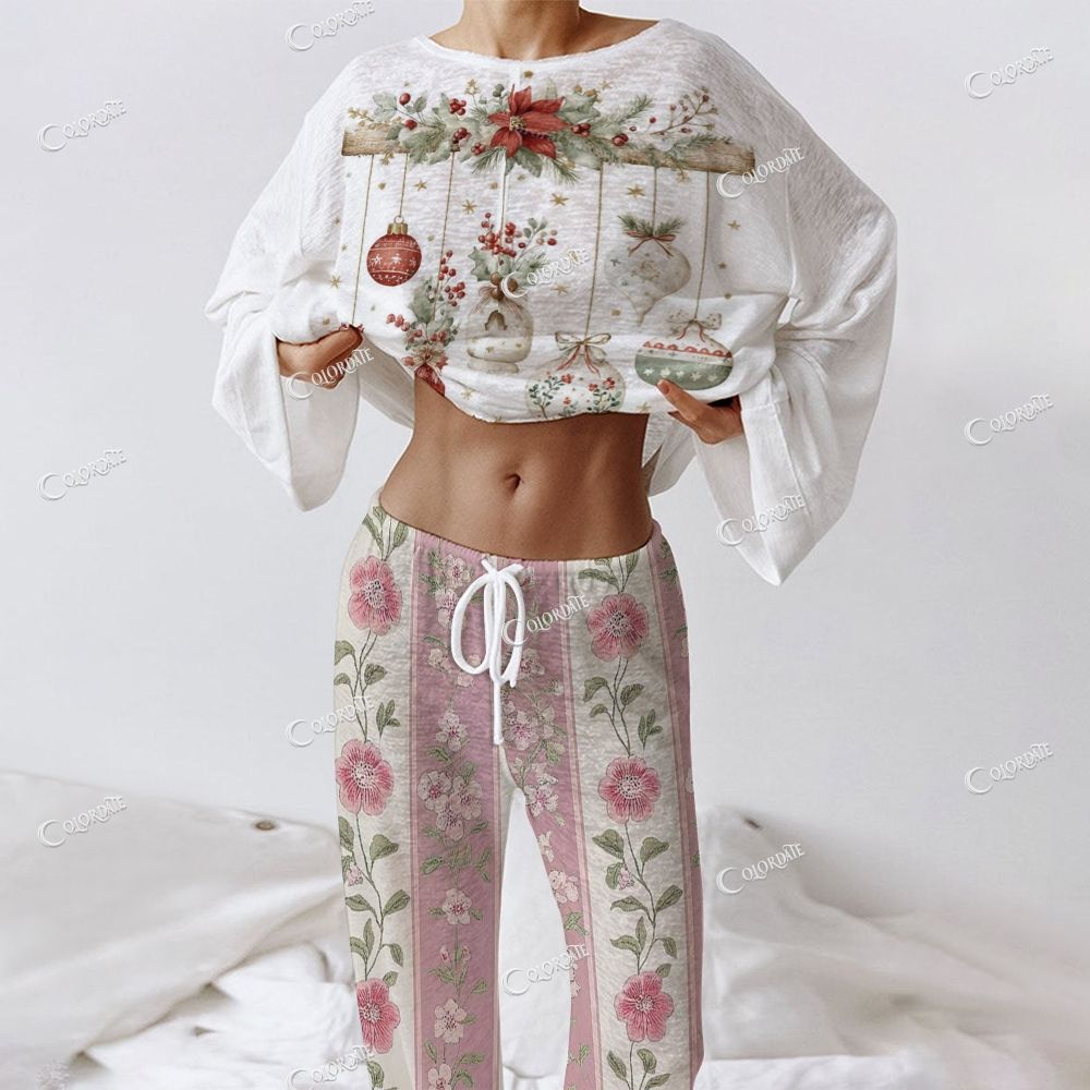 Red Ornament Floral Women's Long Sleeve Cotton Homewear Set
