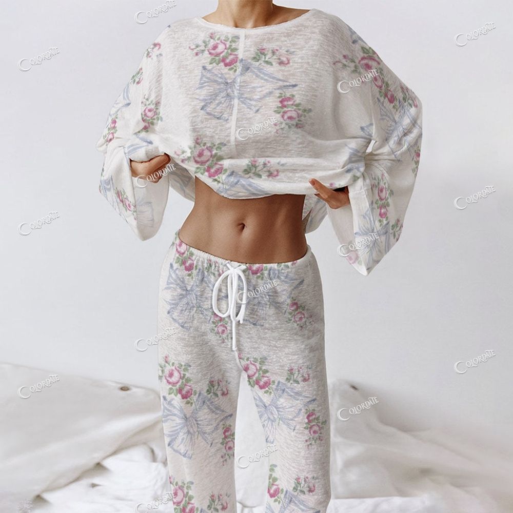 White & Light Blue Floral Loose Women's Long Sleeve Cotton Homewear Set