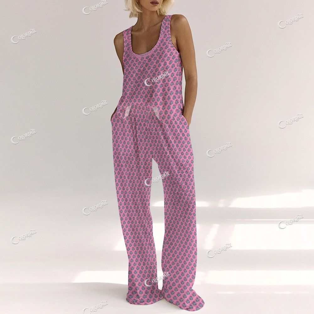 Women's Pink Base Floral Print Vest and Pants Set