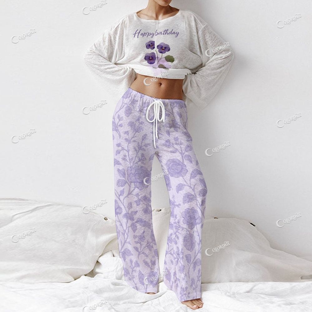 Women's Purple Floral "Happy Birthday" Long Sleeve Cotton Homewear Set