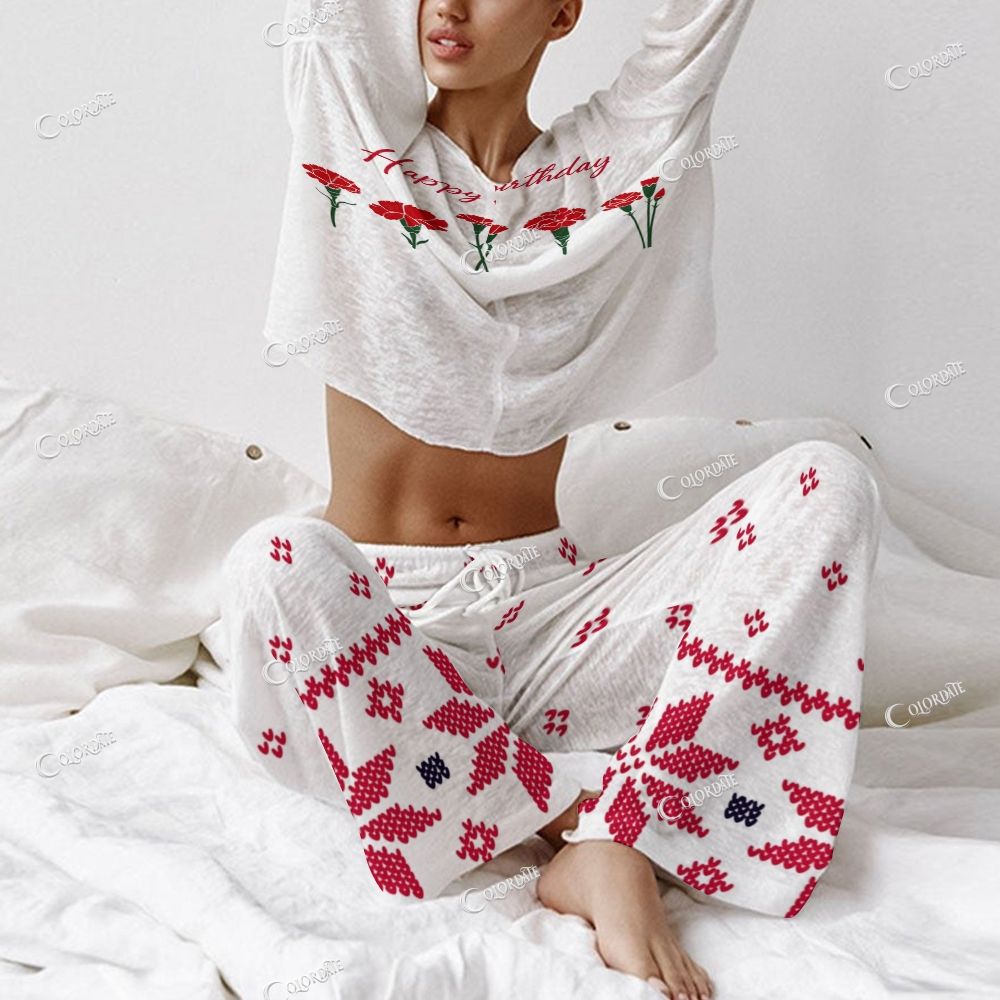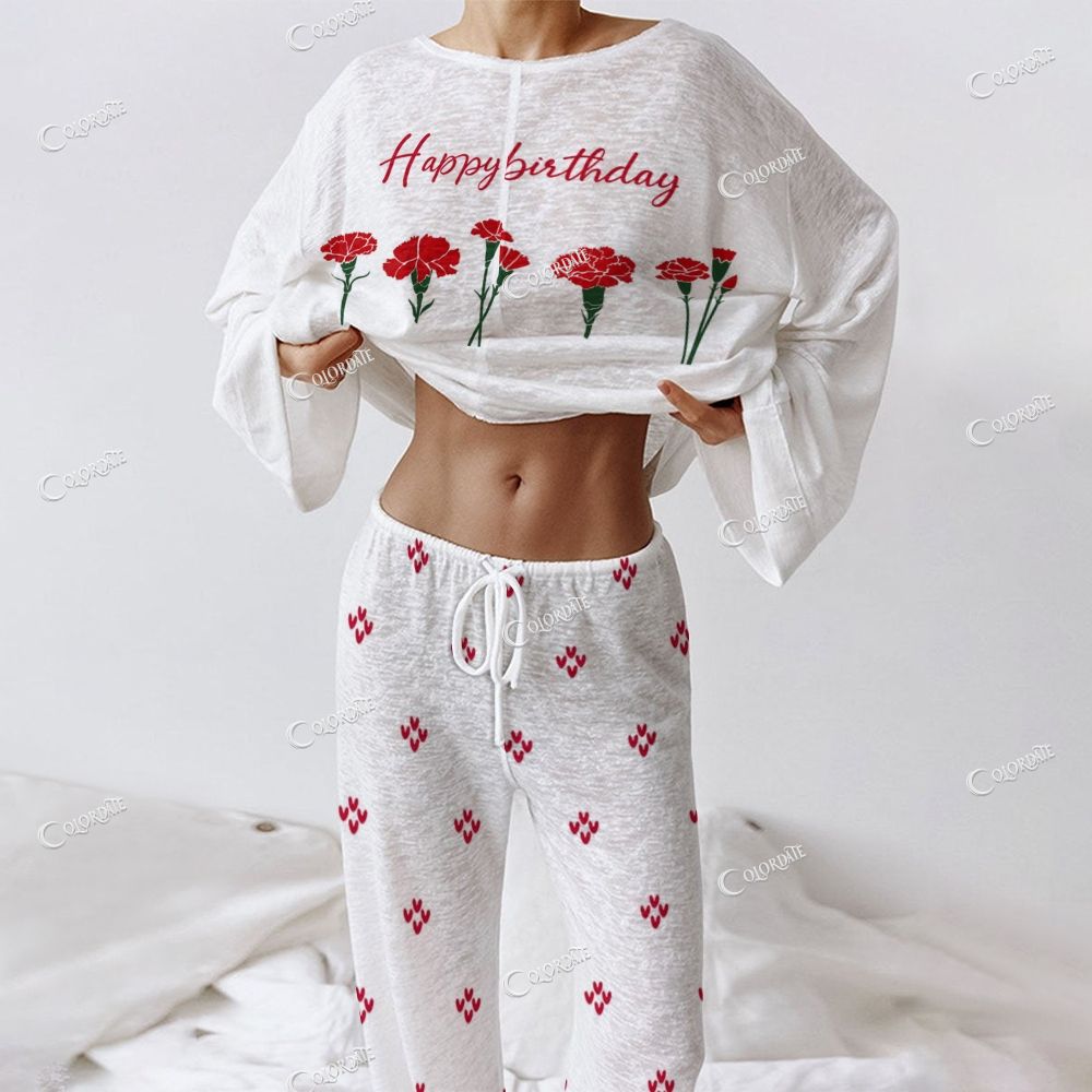 Women's Red Floral "Happy Birthday" Long Sleeve Cotton Homewear Set