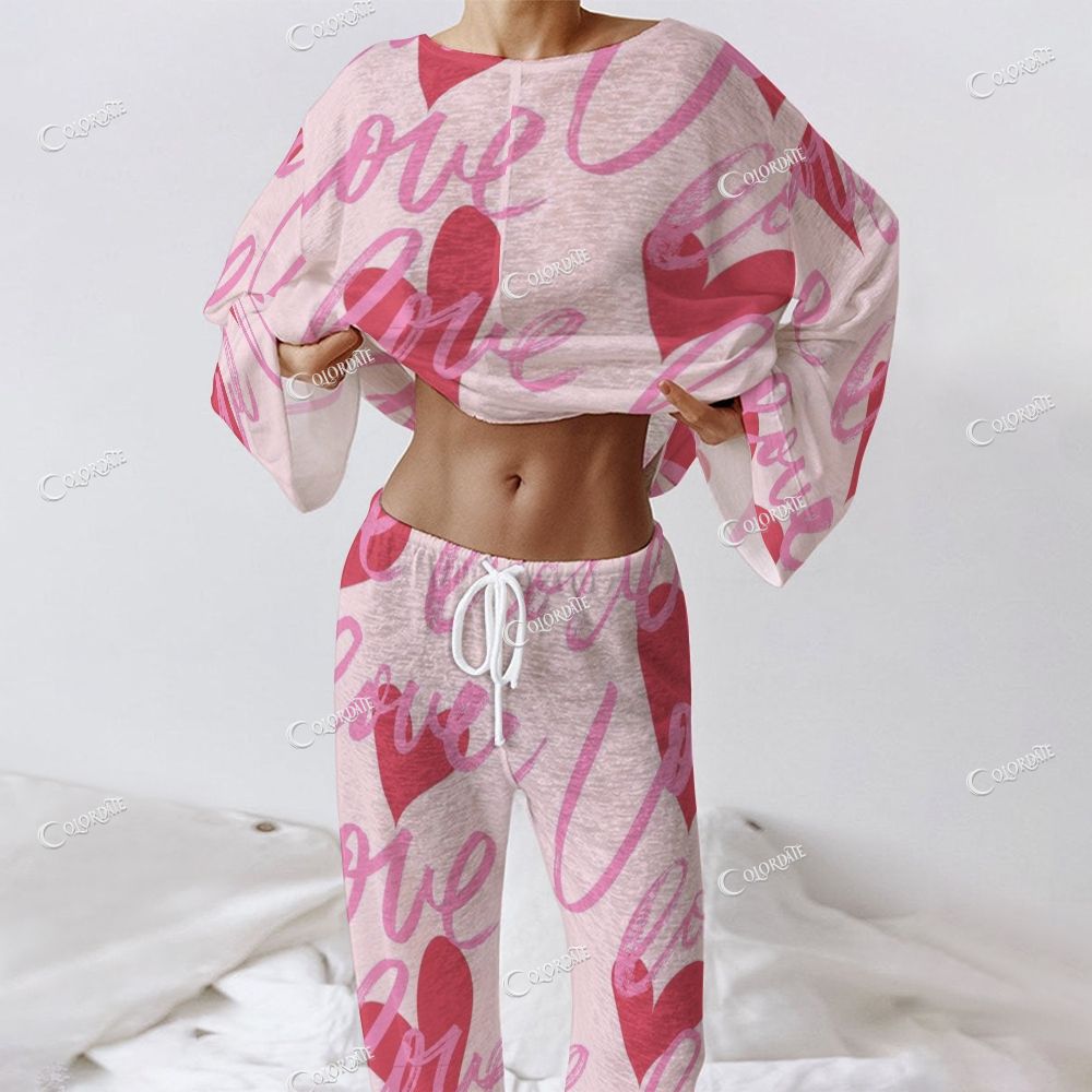 Women's Sweetheart Color-Block Love Print Long Sleeve Cotton Homewear Set