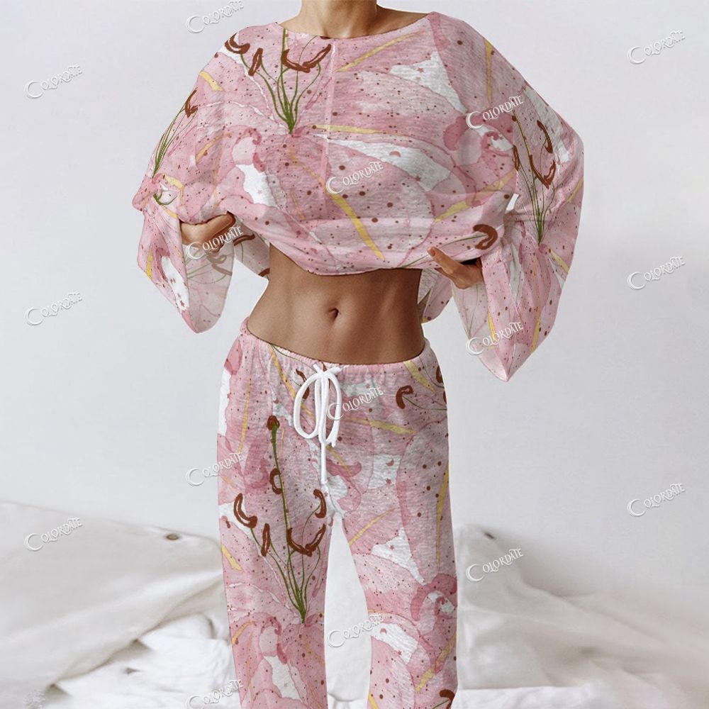 Women's Watercolor Pink Lily Print Long Sleeve Cotton Homewear Set