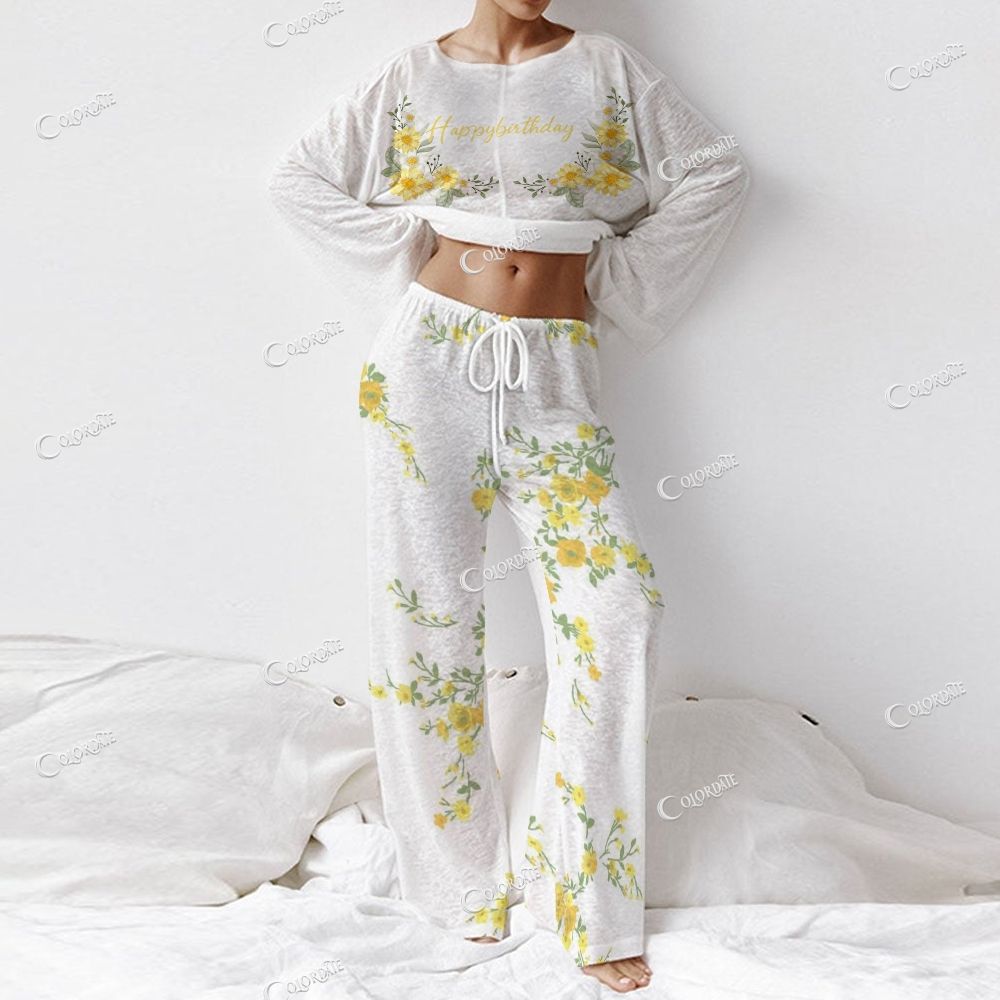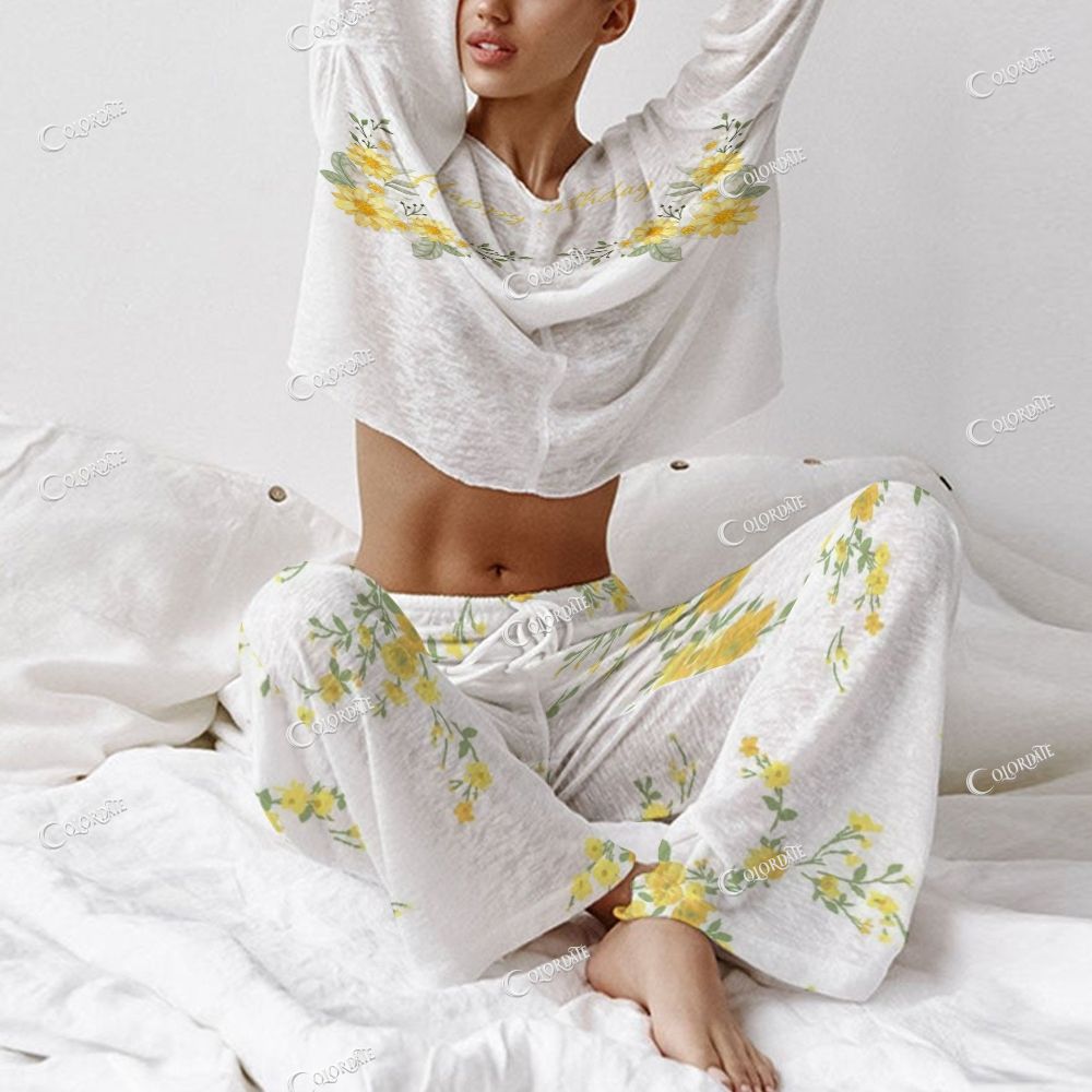 Women's Yellow Floral Print Long Sleeve Cotton Homewear Set 2601012703