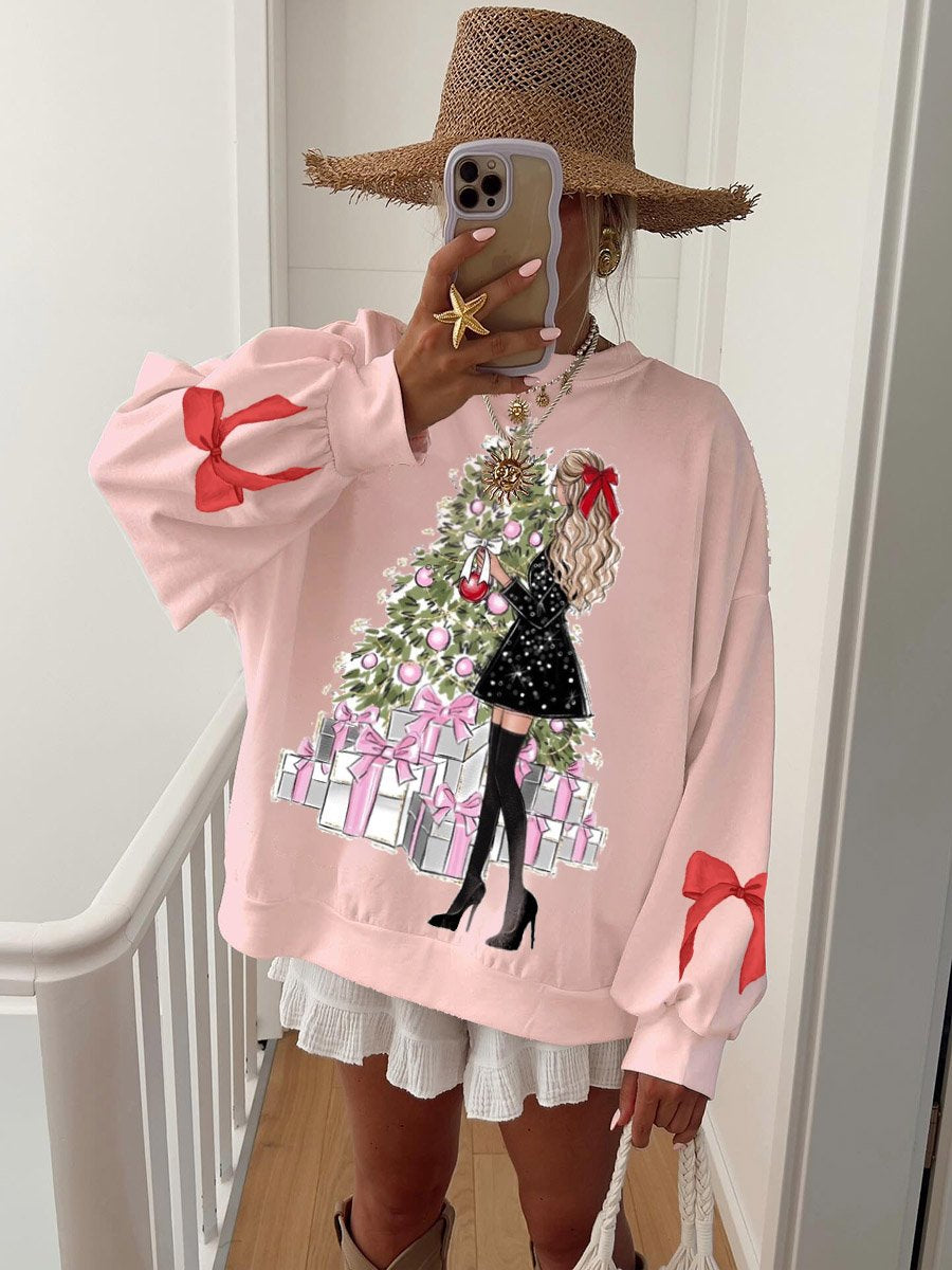 Women's Casual Christmas Tree Character Print Crewneck Sweatshirt