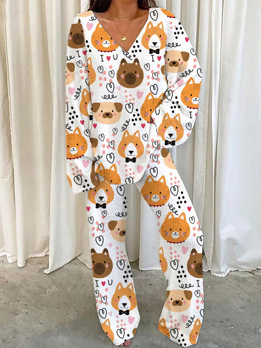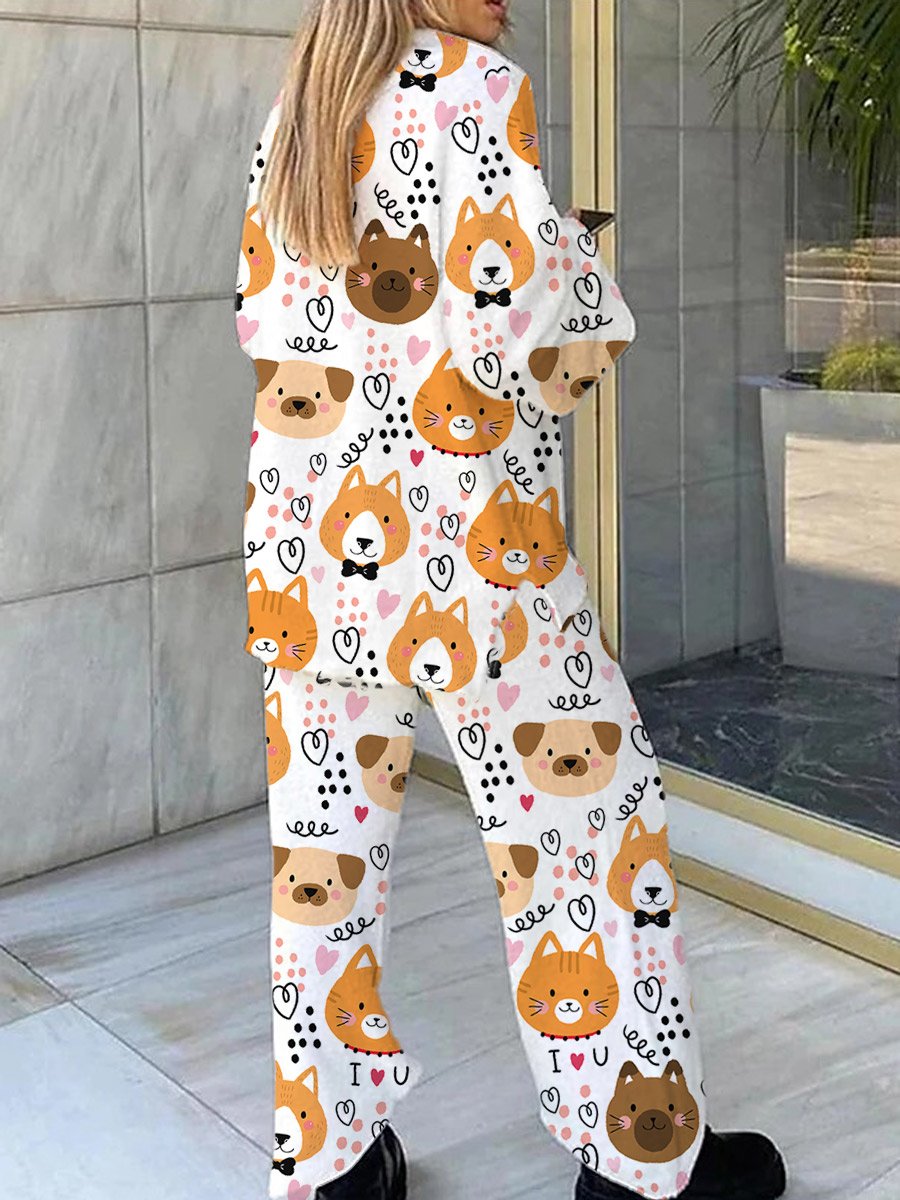 Women's Cat and Dog Animal Print Home Long Sleeve Suit