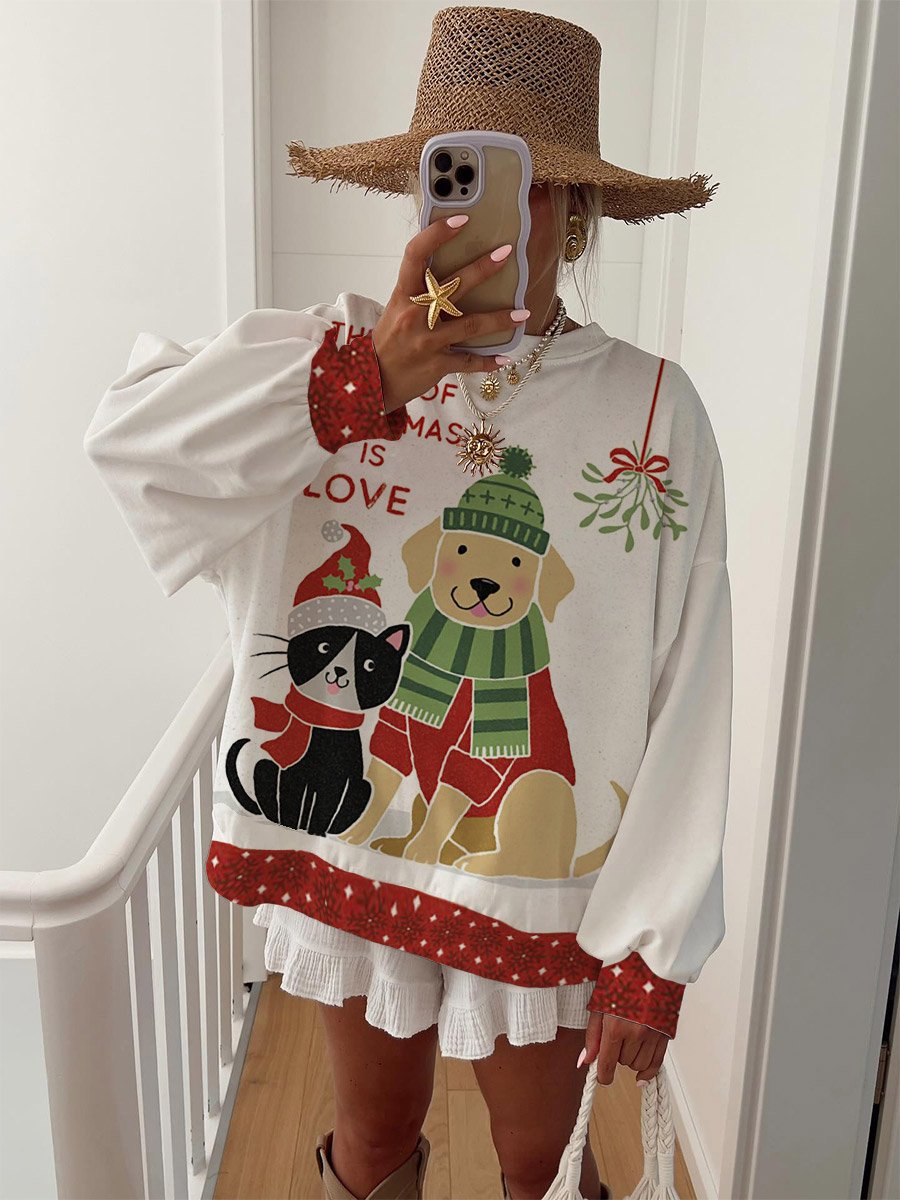Women's Cat and Dog Pattern Round Neck Long Sleeve Sweatshirt