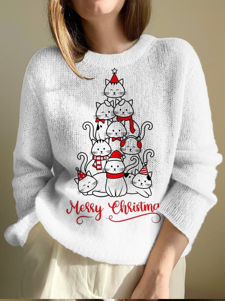 Women's Cat Christmas Tree Print Home Crew Neck Sweater