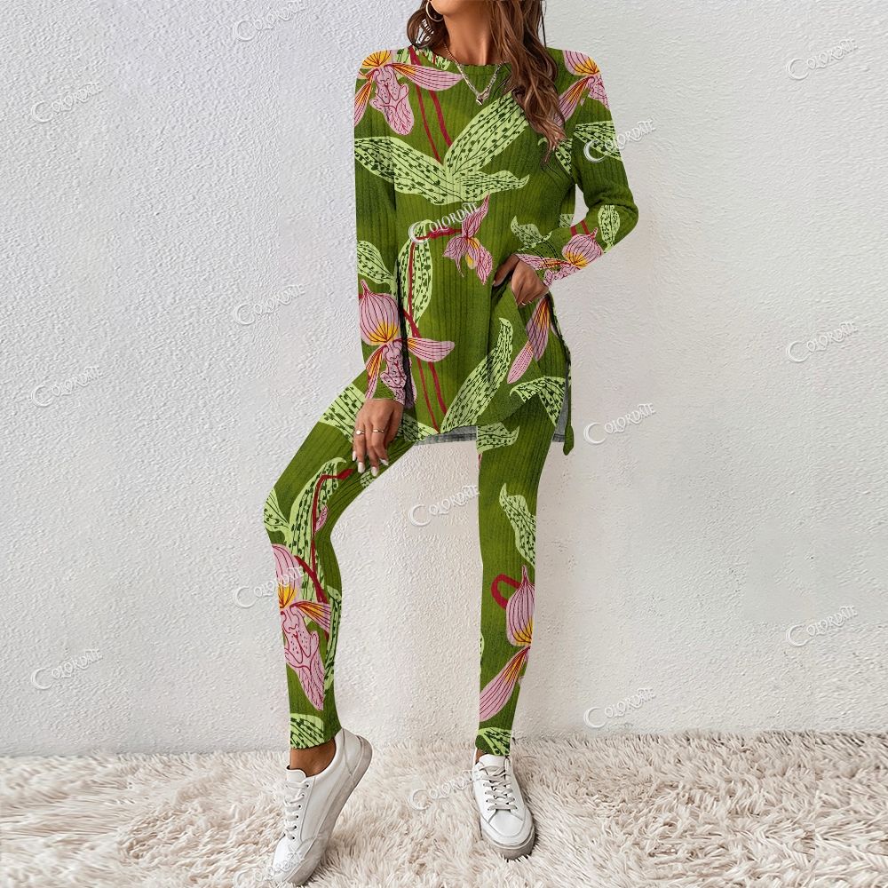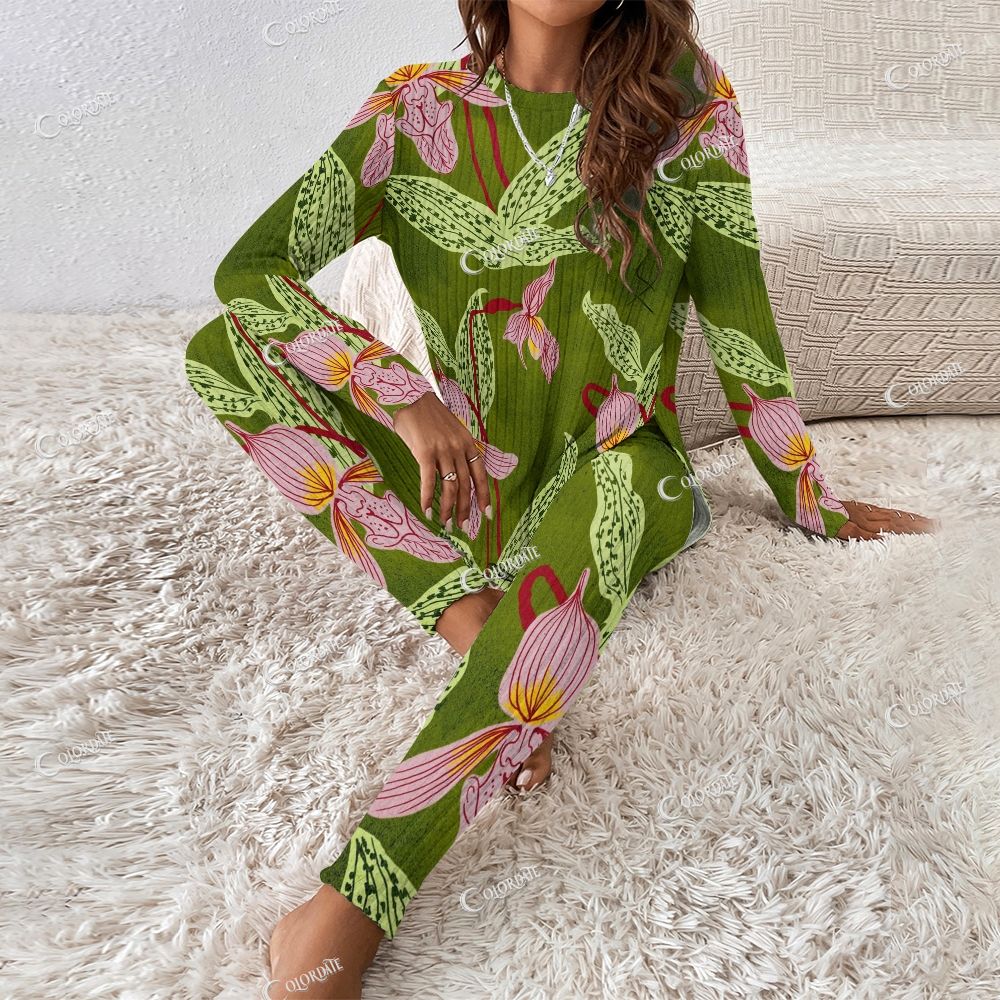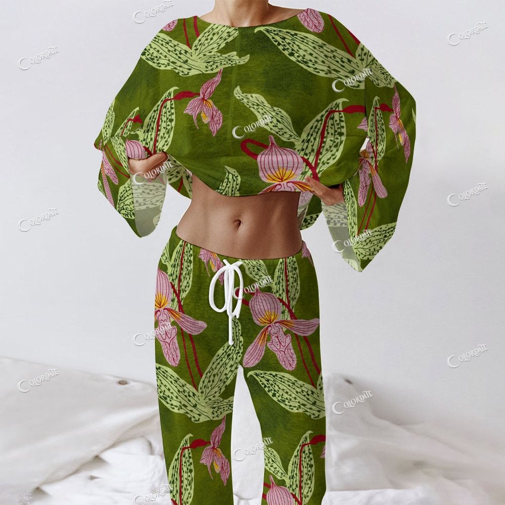 Women's Green Orchid Print Long Sleeve Cotton Homewear Set