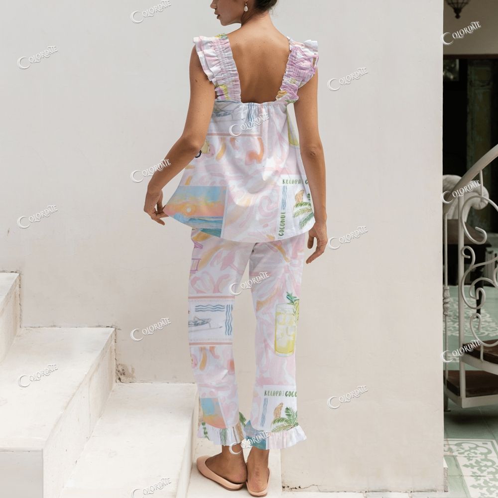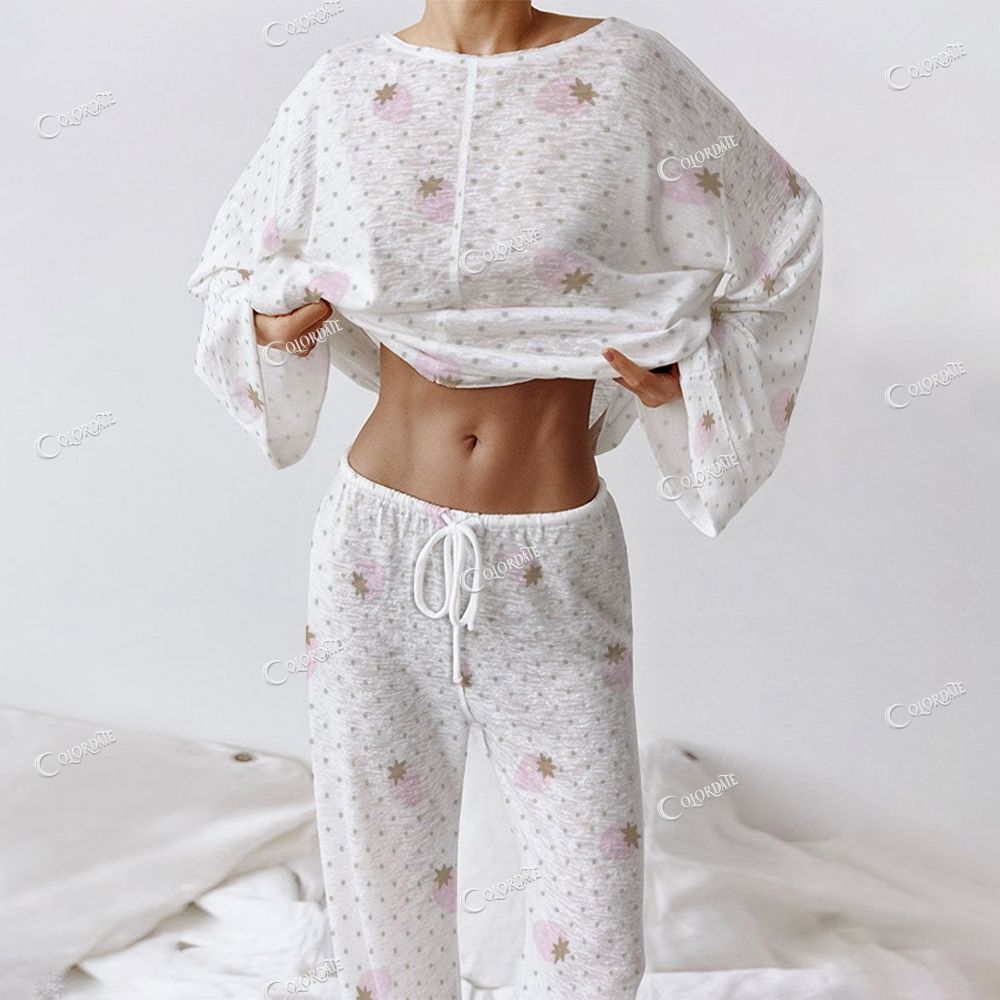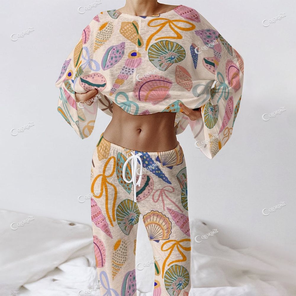 Women's Colorful Seashell & Starfish Print Long Sleeve Cotton Homewear Set