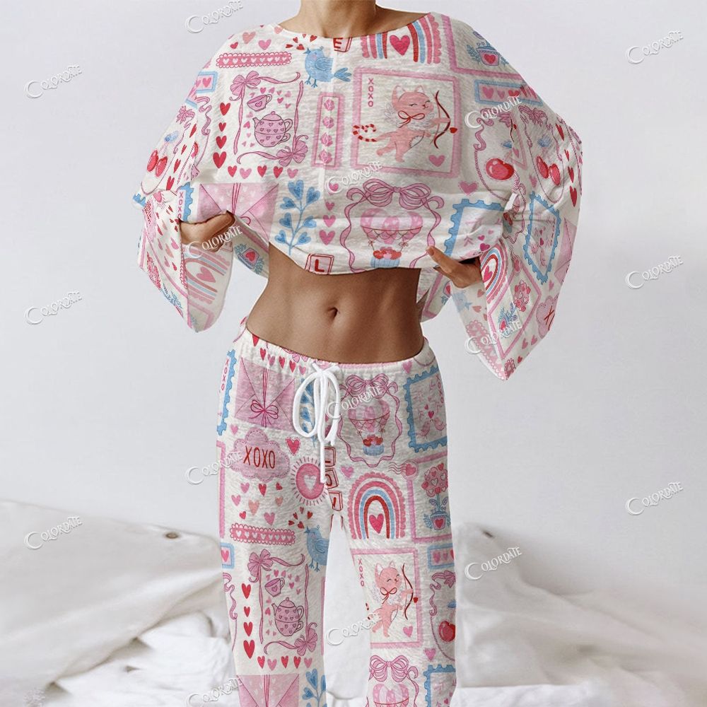 Pink Love Hearts And Love Prints Women's Long Sleeve Cotton Homewear Set