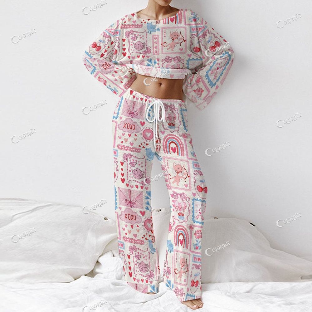 Valentine's Day Themed Patchwork Doodle Print Women's Long Sleeve Cotton Homewear Set