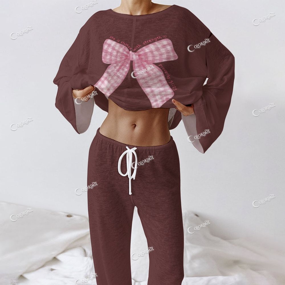 Women's Gingham Bow Print Dark Brown & Pink Long Sleeve Cotton Homewear Set