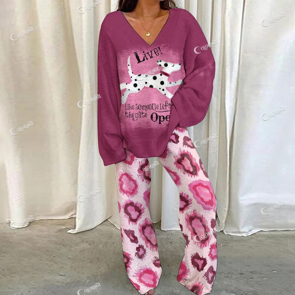 Whimsical Watercolor Fashion Girl & Playful Pet Print Loungewear Set For Women